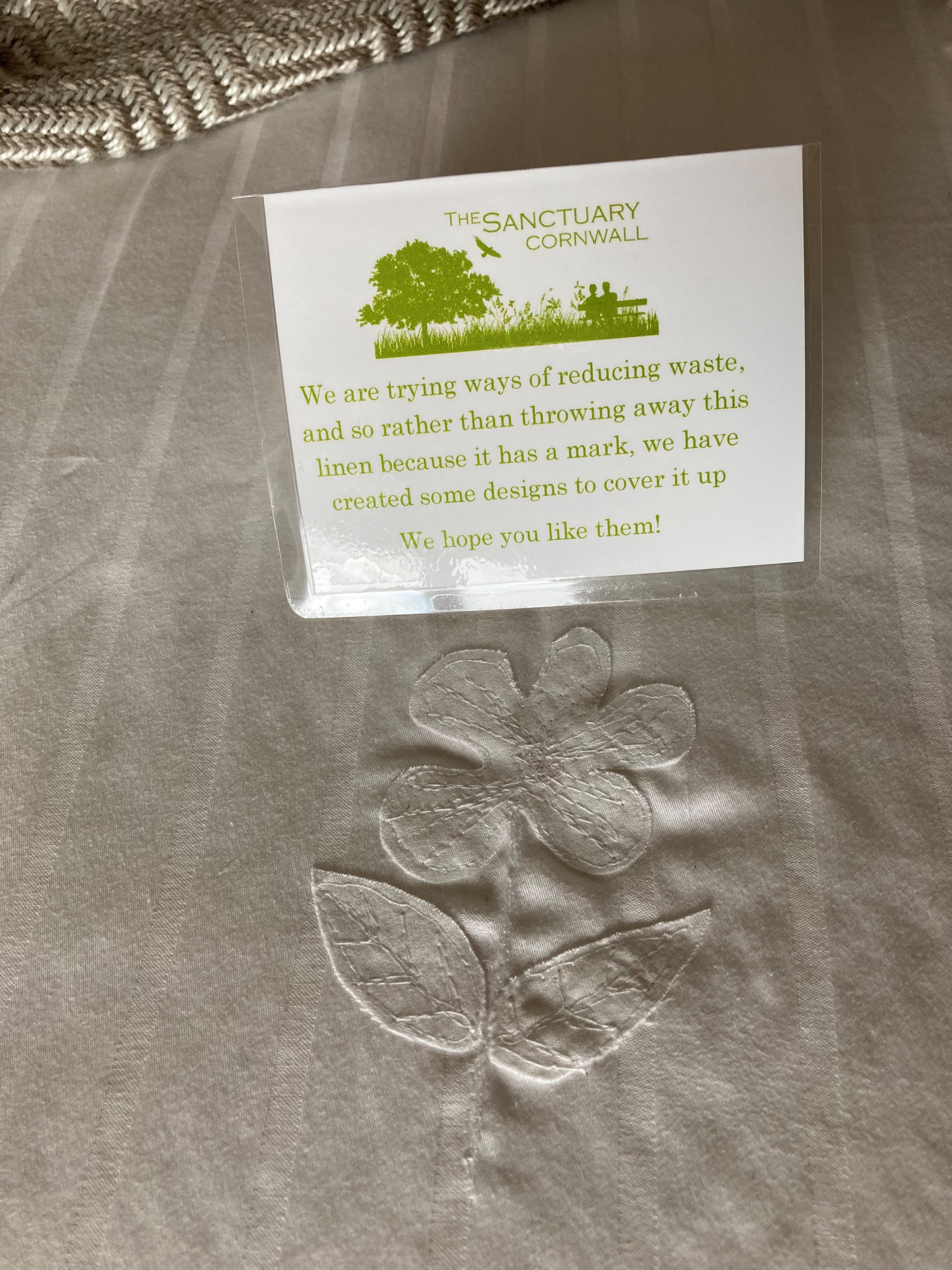 - Repair – can we get things mended, repainted? A large proportion of our linen eventually gets marked, sometimes only a tiny spot, and I’m not going to waste fair trade, certified expensive bedding! So I cut flowers and leaves from the same fabric and embroider over the mark – and leave a note explaining what I’ve done.