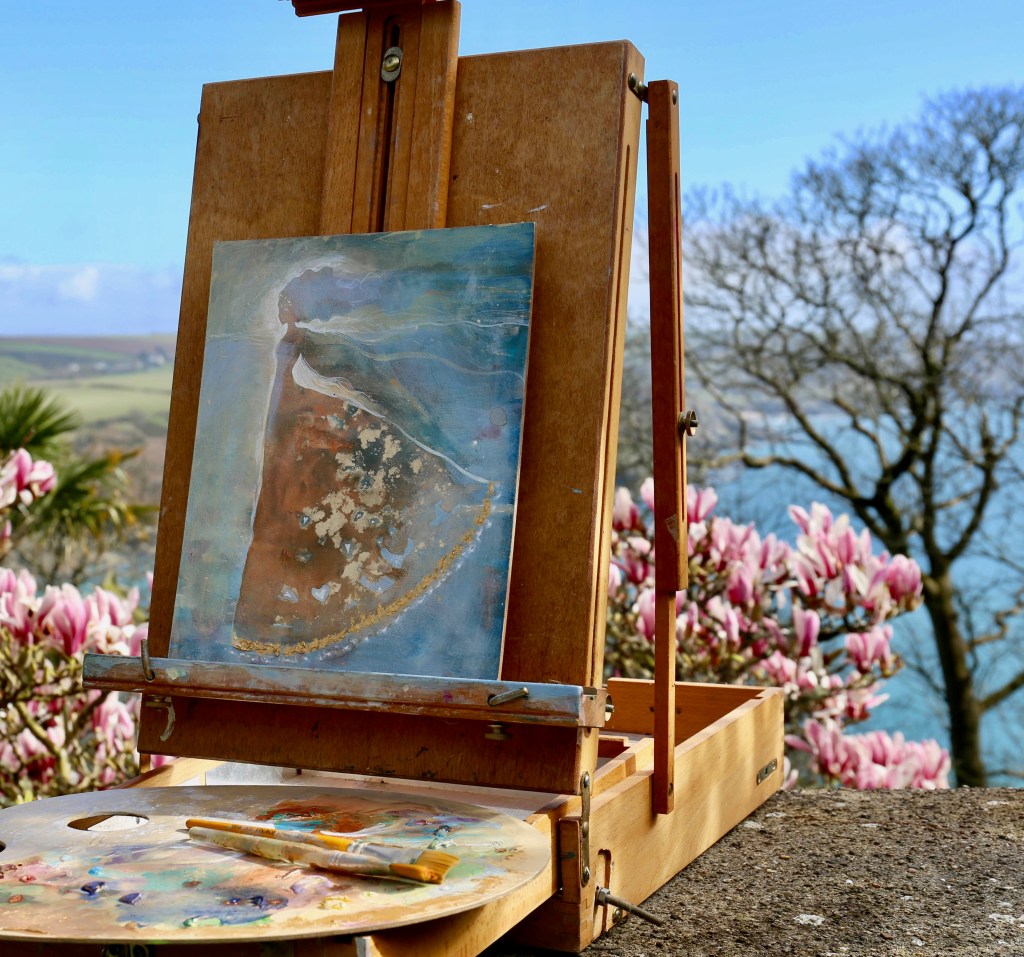 I love nothing more than packing my easel and paints to set out at dawn onto the coast path to find the perfect spot to paint. I often return to the cliff walks of Bolt head and Bolt Tail, with ancient hedgerows and woodlands on the look out for little Devon delights of flora that could easily be missed. The light illuminating the sea thrift on the cliffs and melting the dew on the sea grasses. I am discovering more about the native plants that grace this coastline and being still to paint usually gives a chance encounter with wildlife, however small, making my heart sing. The hum of insects, cormorants flying overhead and the rare glimpse of seals on the rocks; it all combines with the sound of my brush on the canvas to become part of this meditation.