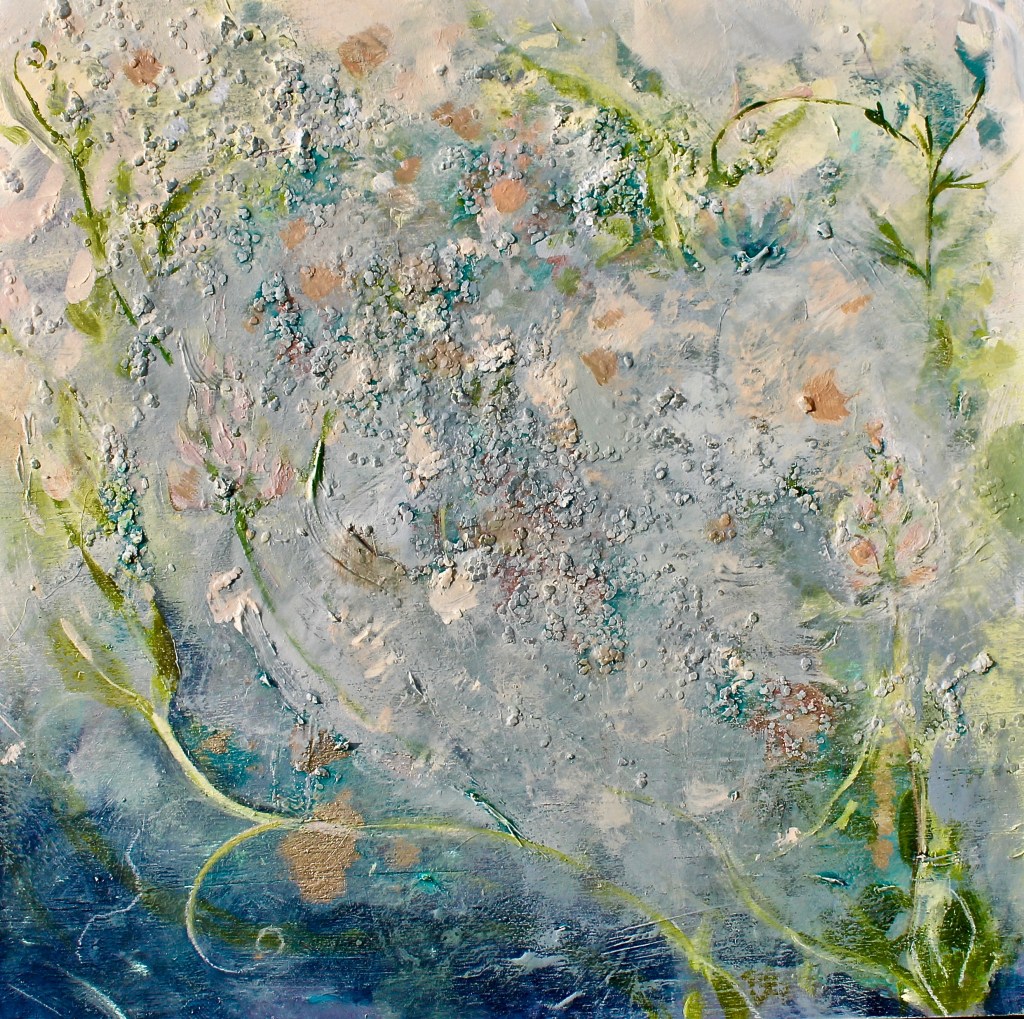 As I work with my brush with numerous layered washes I aim for each mark to look effortless; as a sculptor would chip away at a block to reveal a form. I use a natural colour palette from my surroundings: blue-green mosses, soft floral pinks and yellows, glints of silver and gold for the first golden rays of the sun touching the waves.