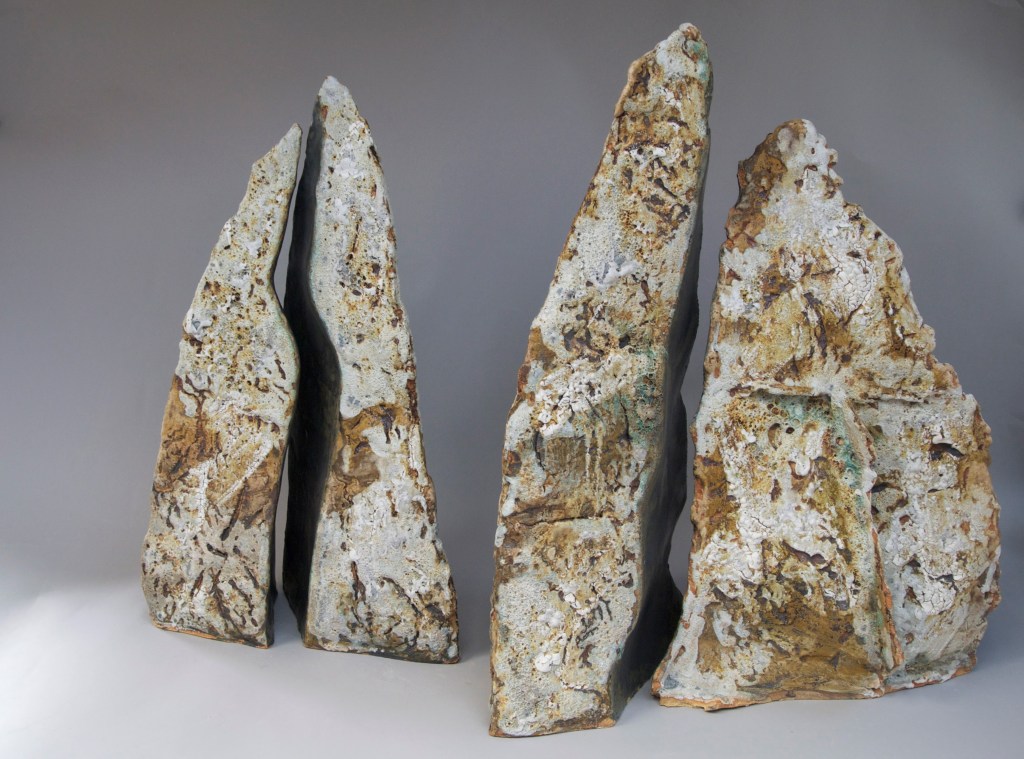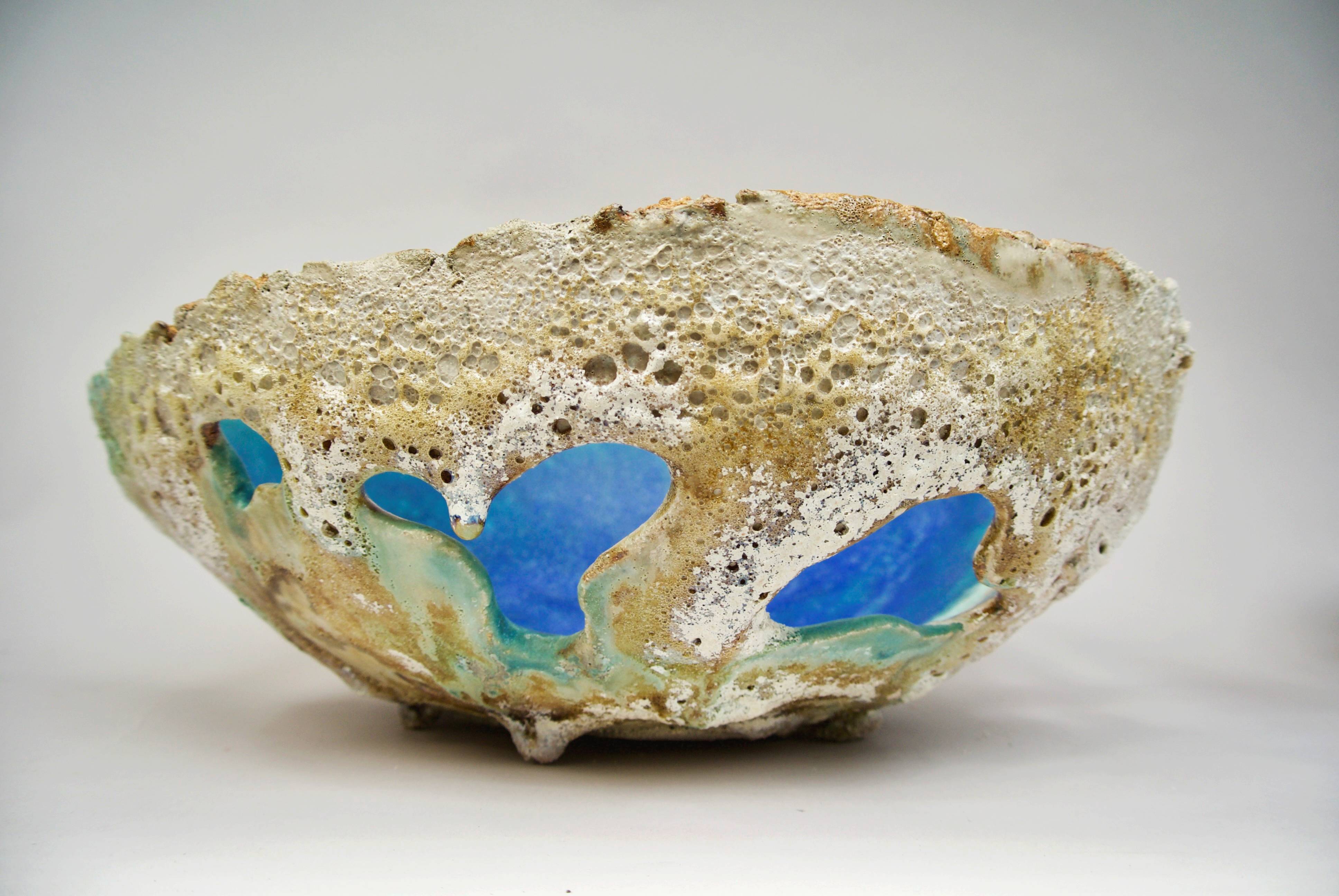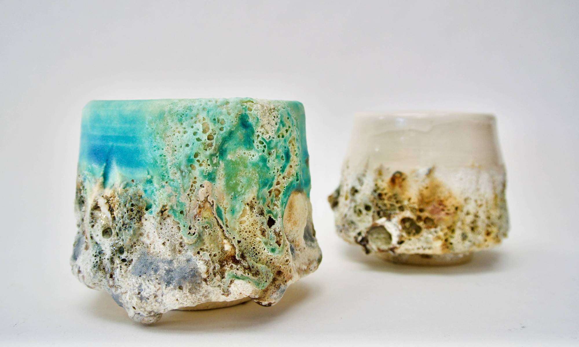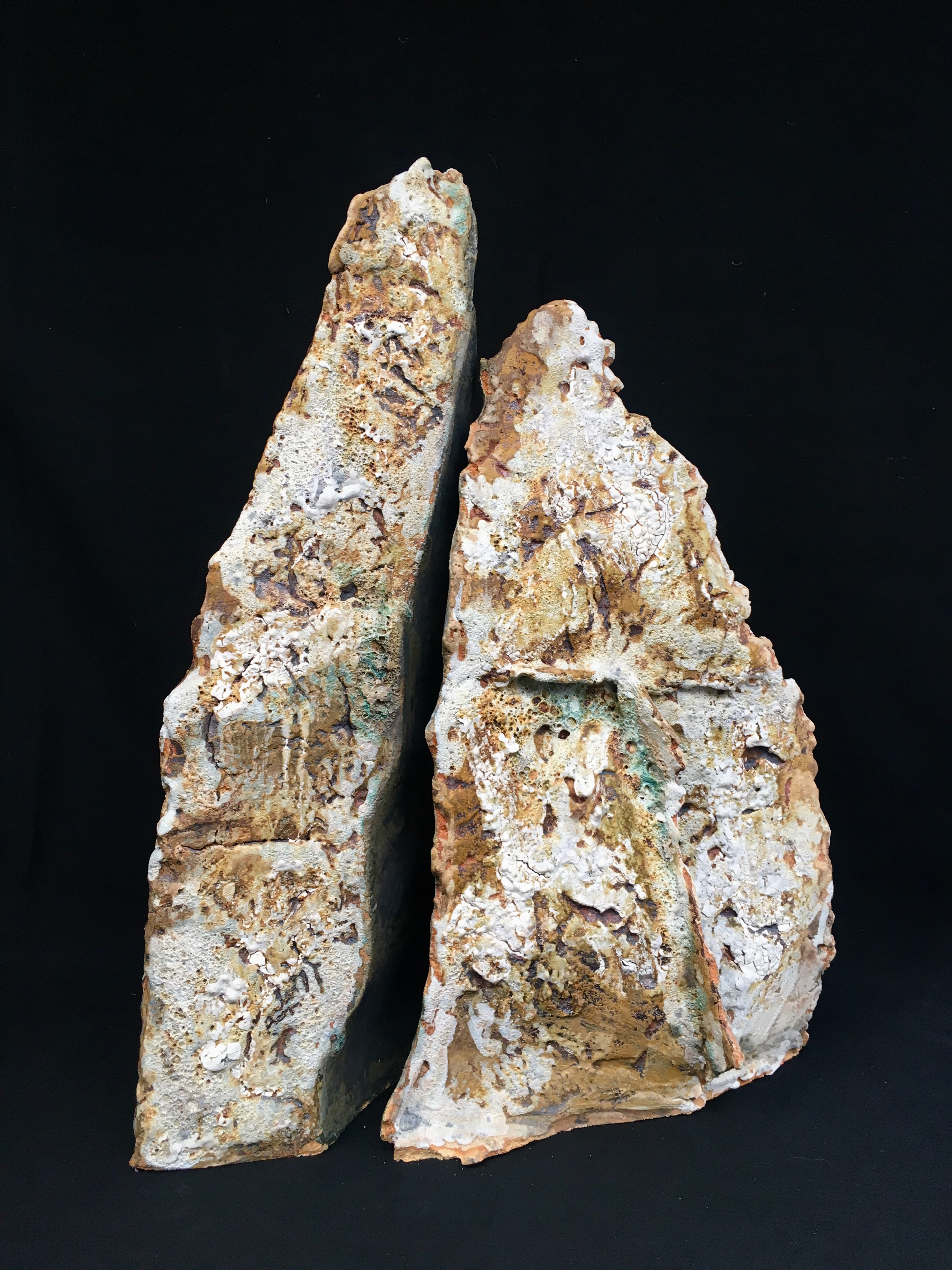 Work explores the material effects of time on the natural world, in particular the interaction between land and sea and the ever-changing landscape of these liminal spaces. I use colour, form and texture to transmute the temporal into the experience. The beautiful and rugged landscape surrounded by the coastline of Cornwall, as well as the Cornish mines, mine deposits and boat/shipwrecks, all offer a rich source of inspiration. Their structures and weathered and corroded textures are reflected in the construction of my clay forms.