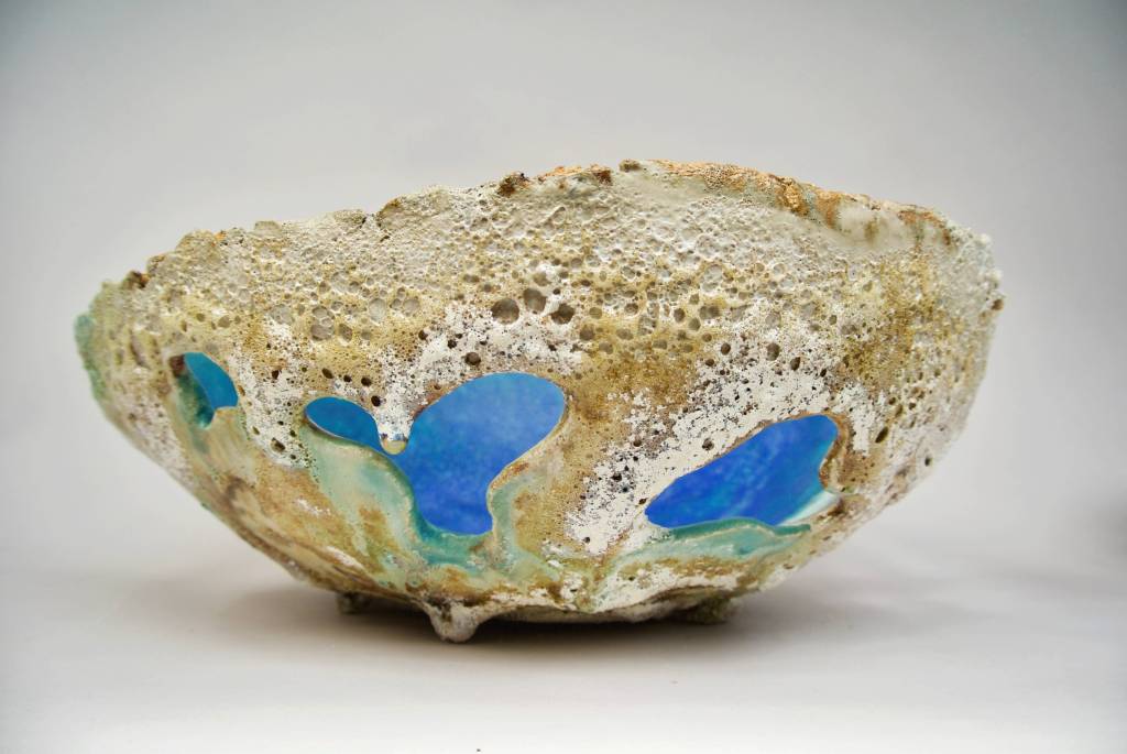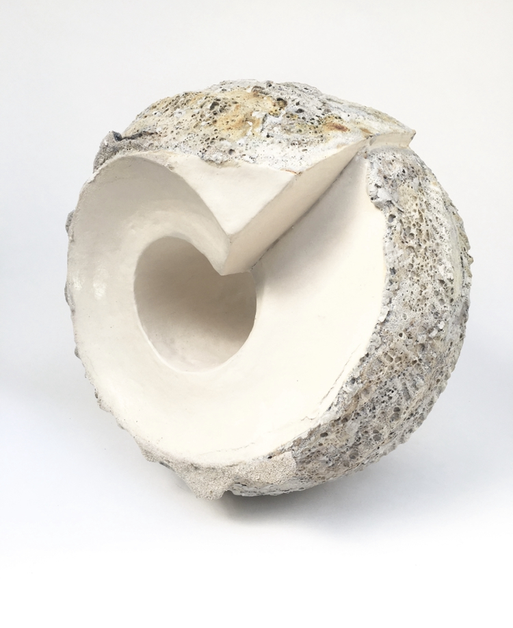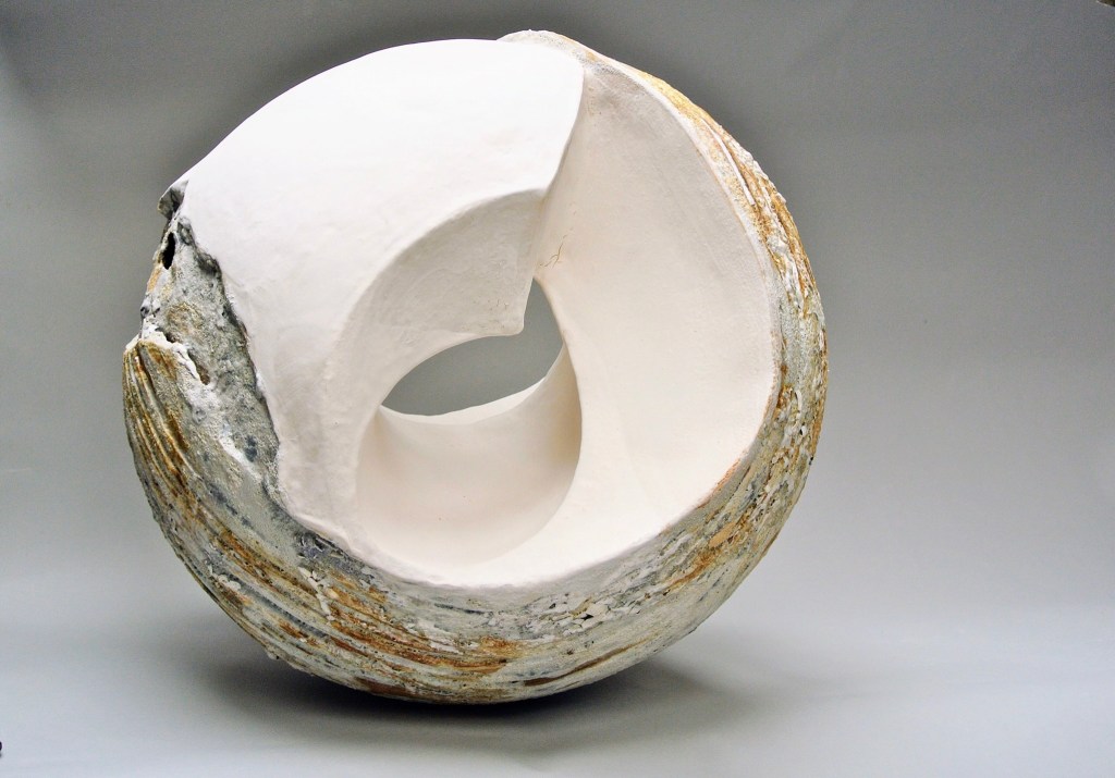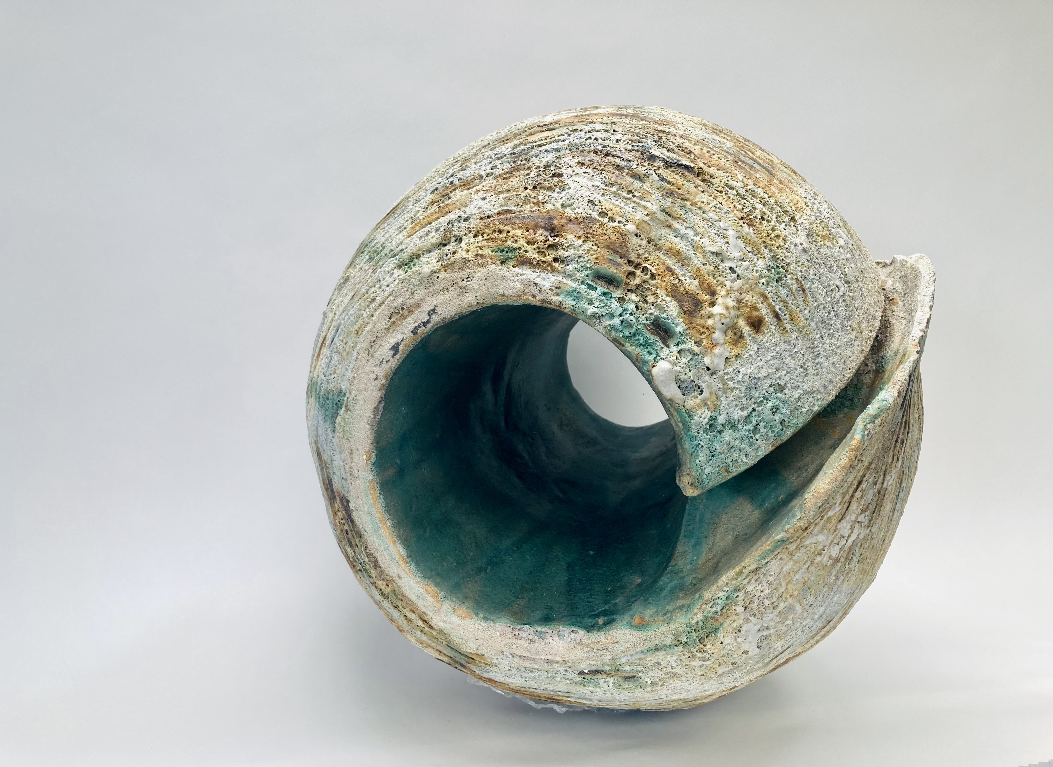 My pieces are built by hand with a local clay from along the South West Coast Path at St Agnes, a heavily grogged stoneware clay suitable for both inside and outside. Local raw clays from around the coast are collected and used in conjunction with slips. I mainly build using the coil and slab process then pieces are cut, reshaped and sculpted; adding and removing sections as the piece evolves. This results in a spontaneous and instinctive sculpture, which invites the eye to explore it from all angles – in, around and through.