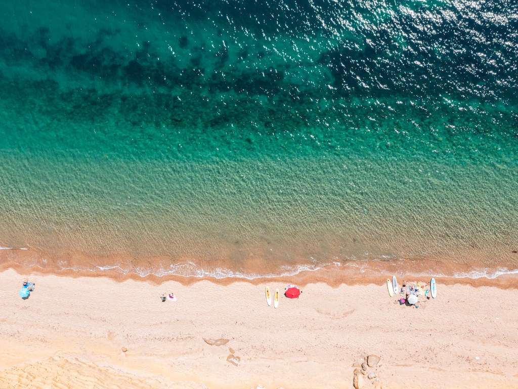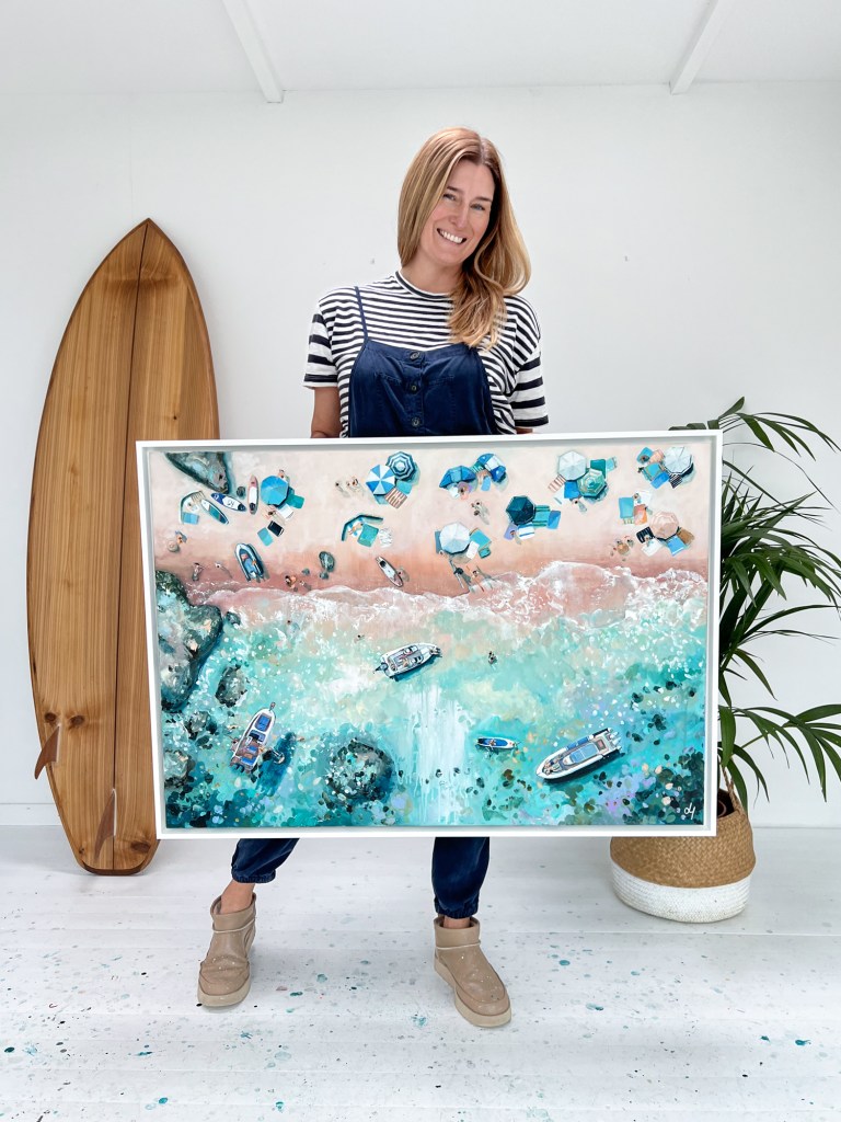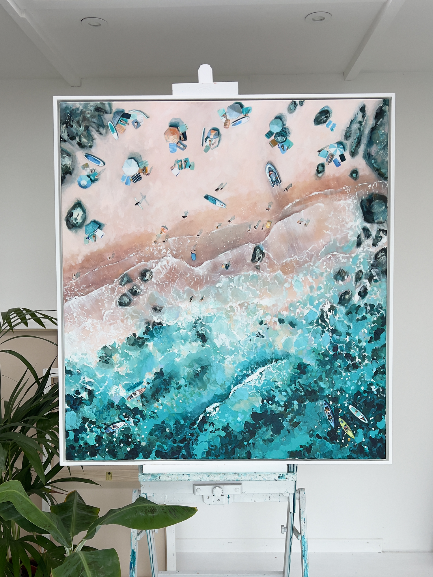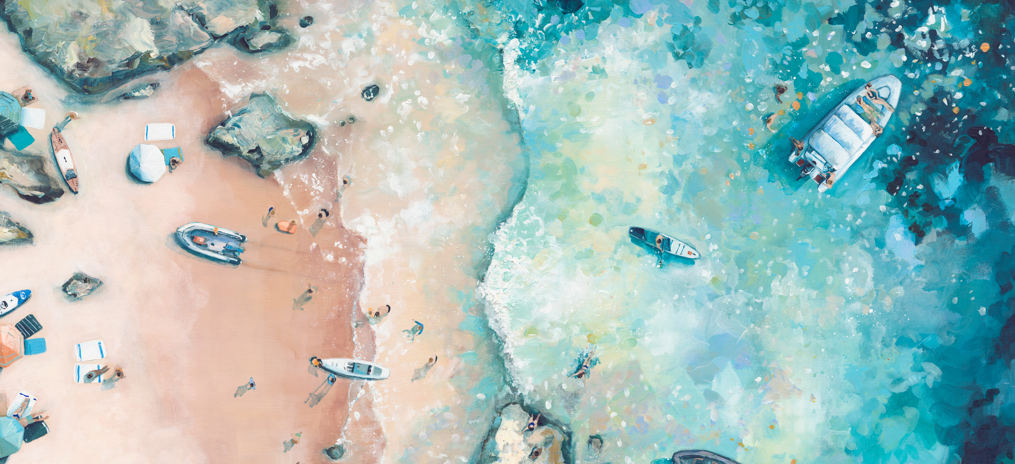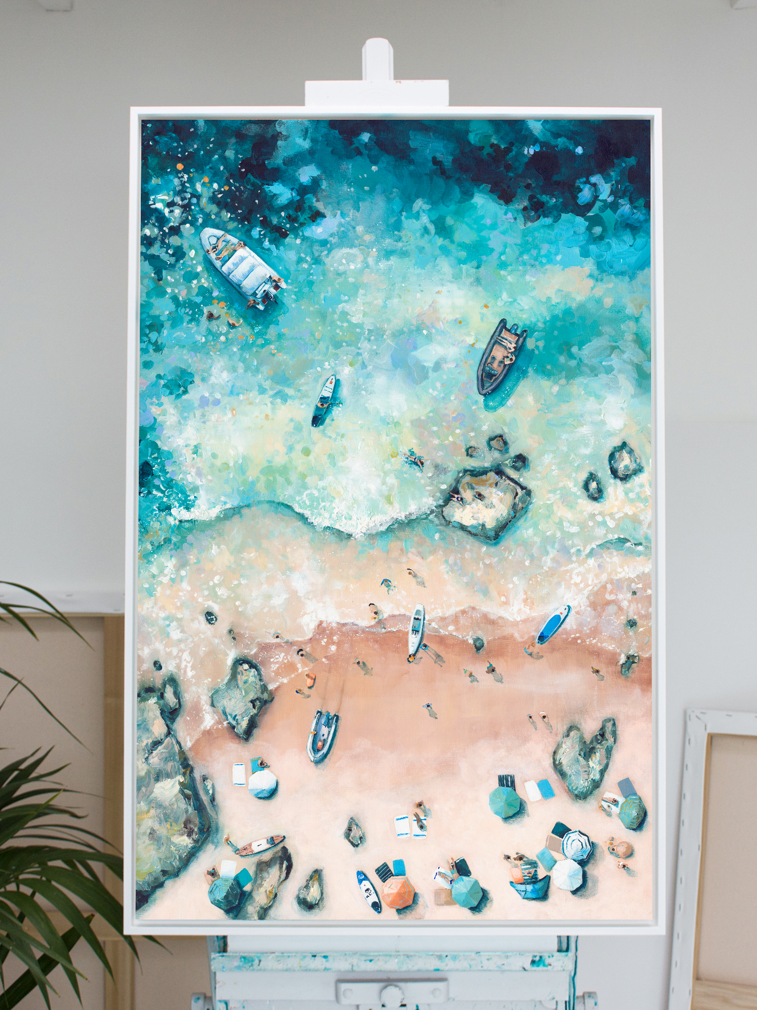 The sea is a constant source of inspiration, and it never ceases to impress me. I am mesmerised by its beauty, and I am humbled by its power. In the spring and summer, I spend as much time immersed in the sea as well as on the shores. Observing human interaction with the ocean is something which stirs my soul. Taking my art into an aerial view gives me the capacity to depict touching moments of kinship, alongside the mesmerising beauty of the sparkling turquoise sea.