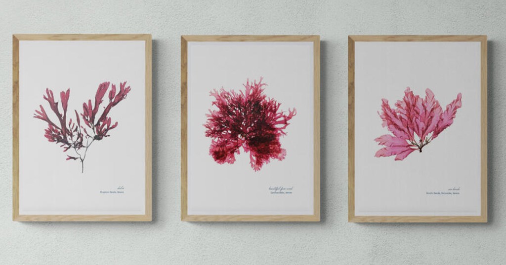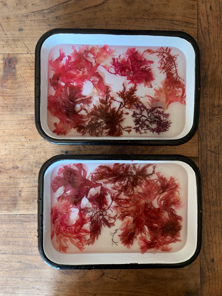 ‘As I picked up small pieces of plastic from the masses of washed-up seaweed, I started to marvel at just how beautiful and diverse the seaweed really is. I took some specimens home and the kids, and I tried hand-pressing them. The results were stunning and soon our family home turned into a seaweed pressing factory!‘