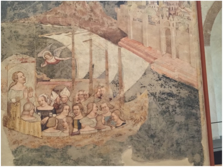 At the request of her father, she set sail with 11,000 virginal handmaidens to join her future husband Conan Meriadoc the pagan governor of Brittany. Ursula declared that before her marriage she would undertake a pilgrimage to Rome, where her intended should be baptised. Hearing that the pagan Huns were besieging Cologne, Ursula persuaded the Pope and Bishop of Ravenna to join her in a holy mission to save the city.
