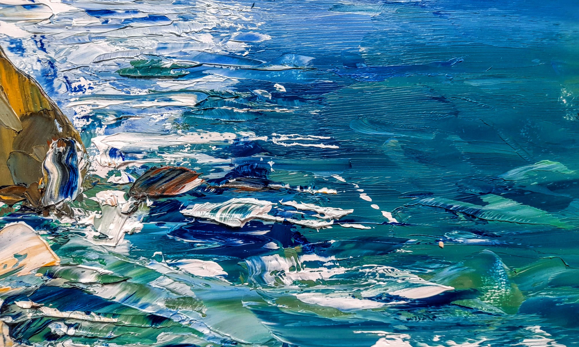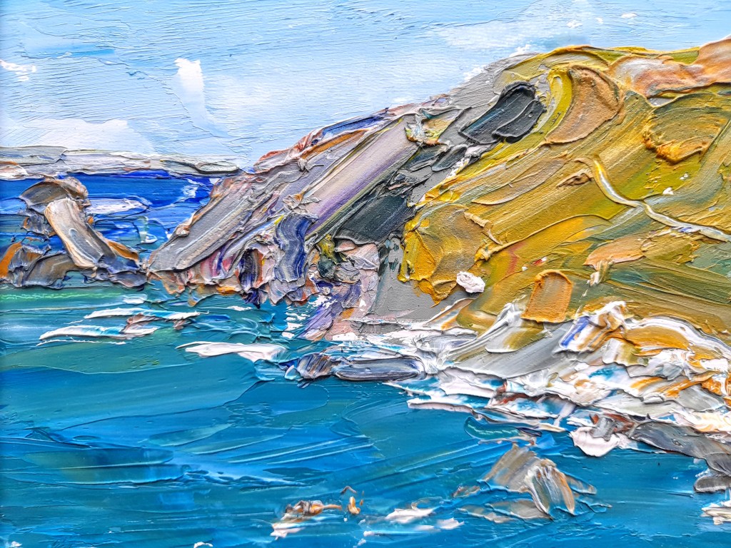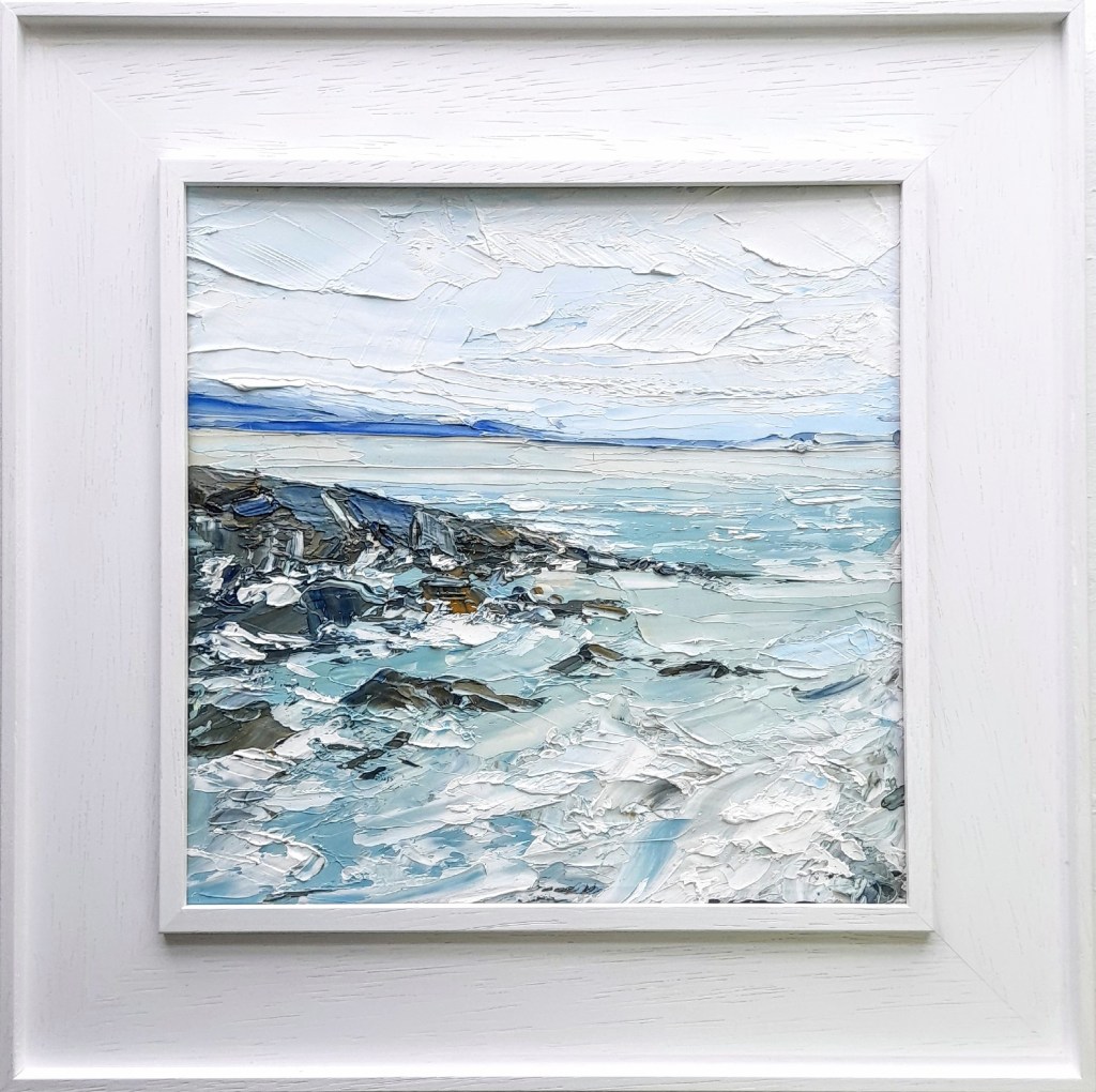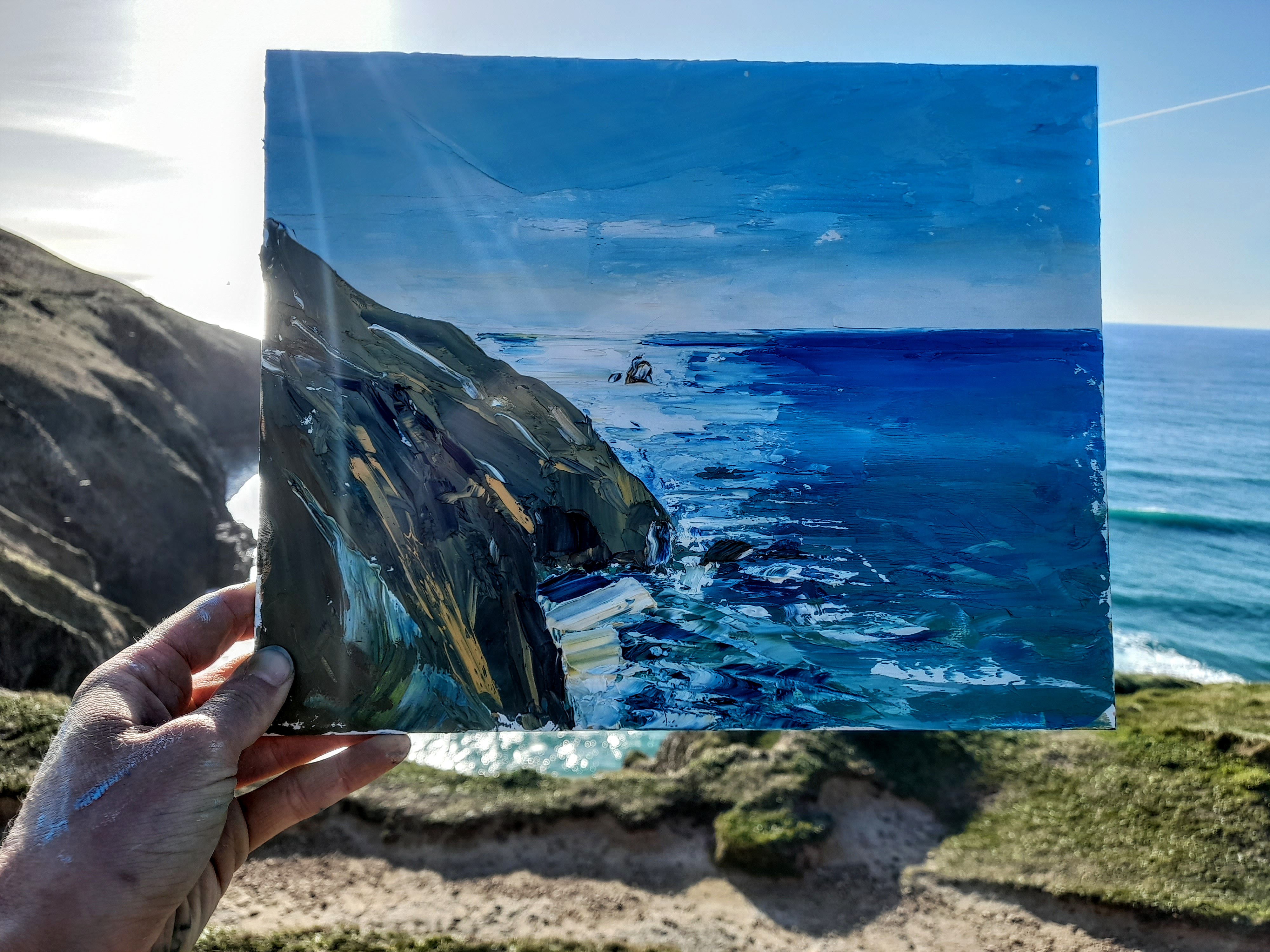 My obsession with painting the sea began on a trip to Zennor near St Ives a few years ago. I was staying on a farm only a couple of fields walk away from the coast paths inspiring views. The light in this part of Cornwall is spectacular and painting in the fresh sea air with the sound of crashing waves in the background was a truly meditative experience. From this trip, the en plein air side of my practice began to flourish. I started the habit of venturing to the coast to paint as often as I could, each time I visit I take home with me not only a collection of paintings but fresh sources of information and inspiration to explore back in the studio.