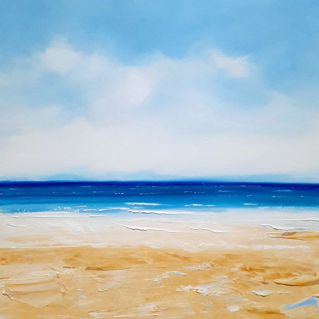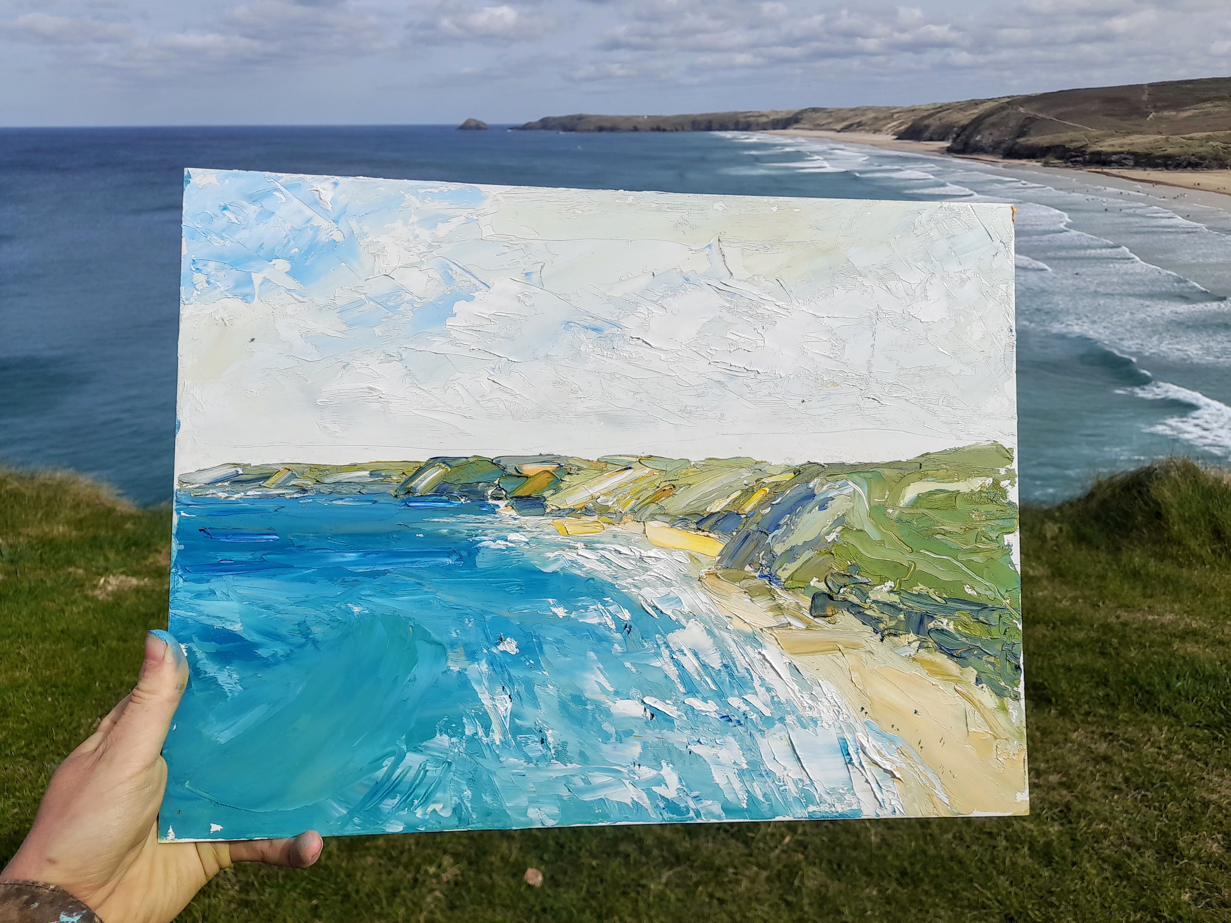 I split my time working between painting from life out in the landscape and painting from memory back in my studio. I work quite quickly and my marks are spontaneous and impulsive, I embrace happy accidents and enjoy the life that can be seen in a painting when the artist works instinctively. My en plein air paintings are a direct response to the landscape; I study the colours, forms and lines in the landscape that stand out to me to create a personal response to the landscape, it still amazes me how much more I see as I’m painting! While I’m working my focus isn’t on how much of a likeness I can achieve but more on an exploration of these elements that I’m drawn to. I find it so interesting to compare the outcome of my painting with the view I was studying, it’s a fascinating insight into what I appreciated most in the landscape. Back in the studio I continue to explore the landscape but in a different way; here is where I revisit my emotional response to a place with my current focus being the beaches of Cornwall. Most of my time in Cornwall has been spent on breaks from real life on holiday with family, it has always been somewhere I’ve experienced a sense of serenity and rejuvenation. Back in the studio, I’ve been working from memories of looking out to sea from the beach, experimenting with ways to translate these feelings through paint.