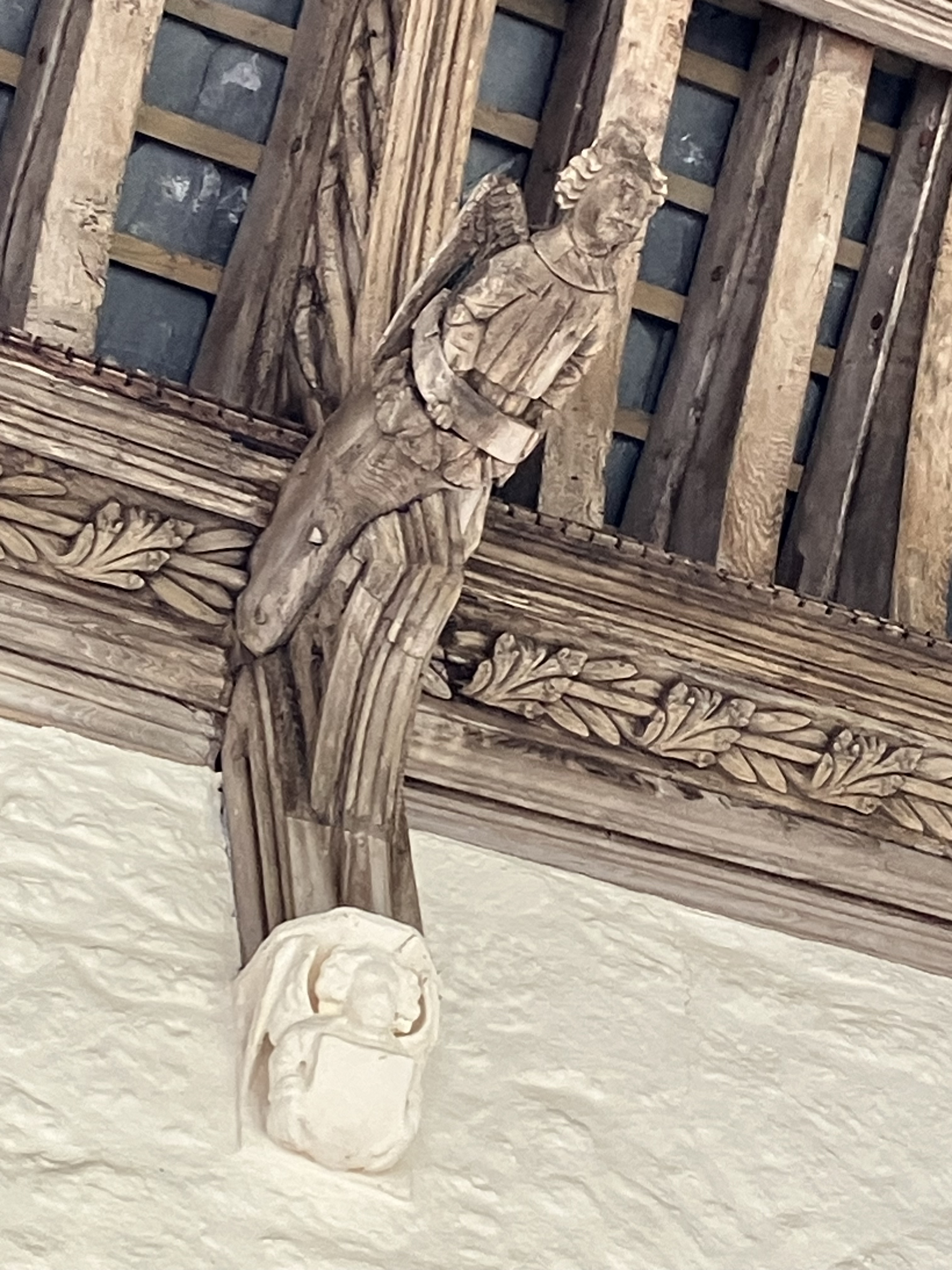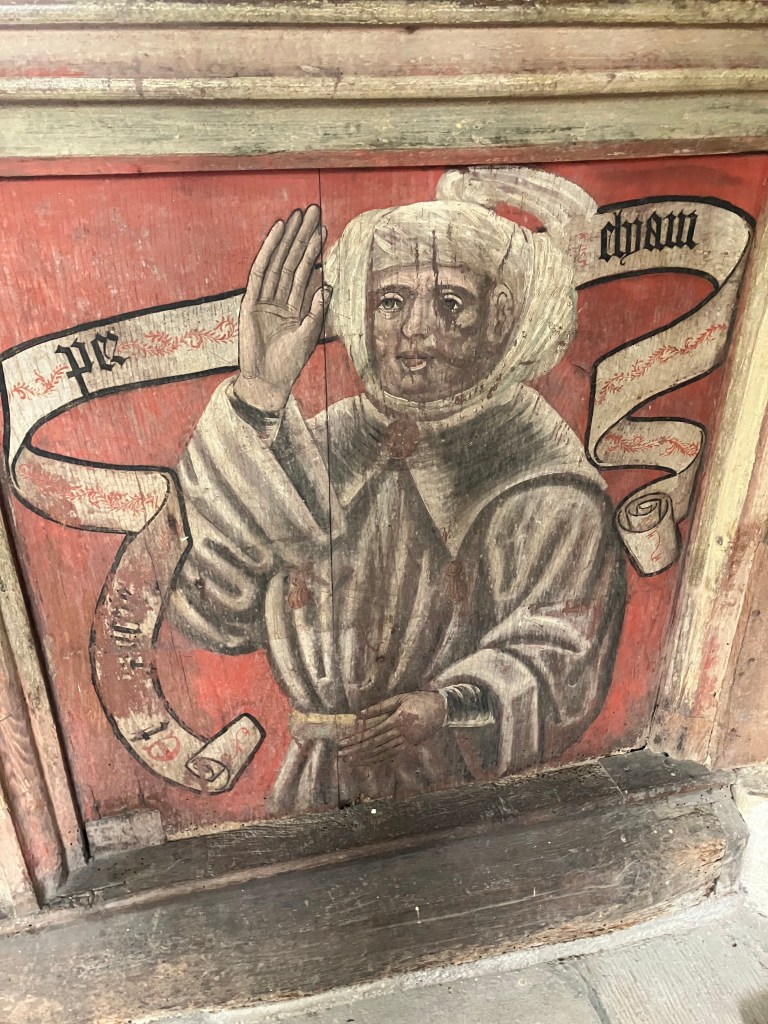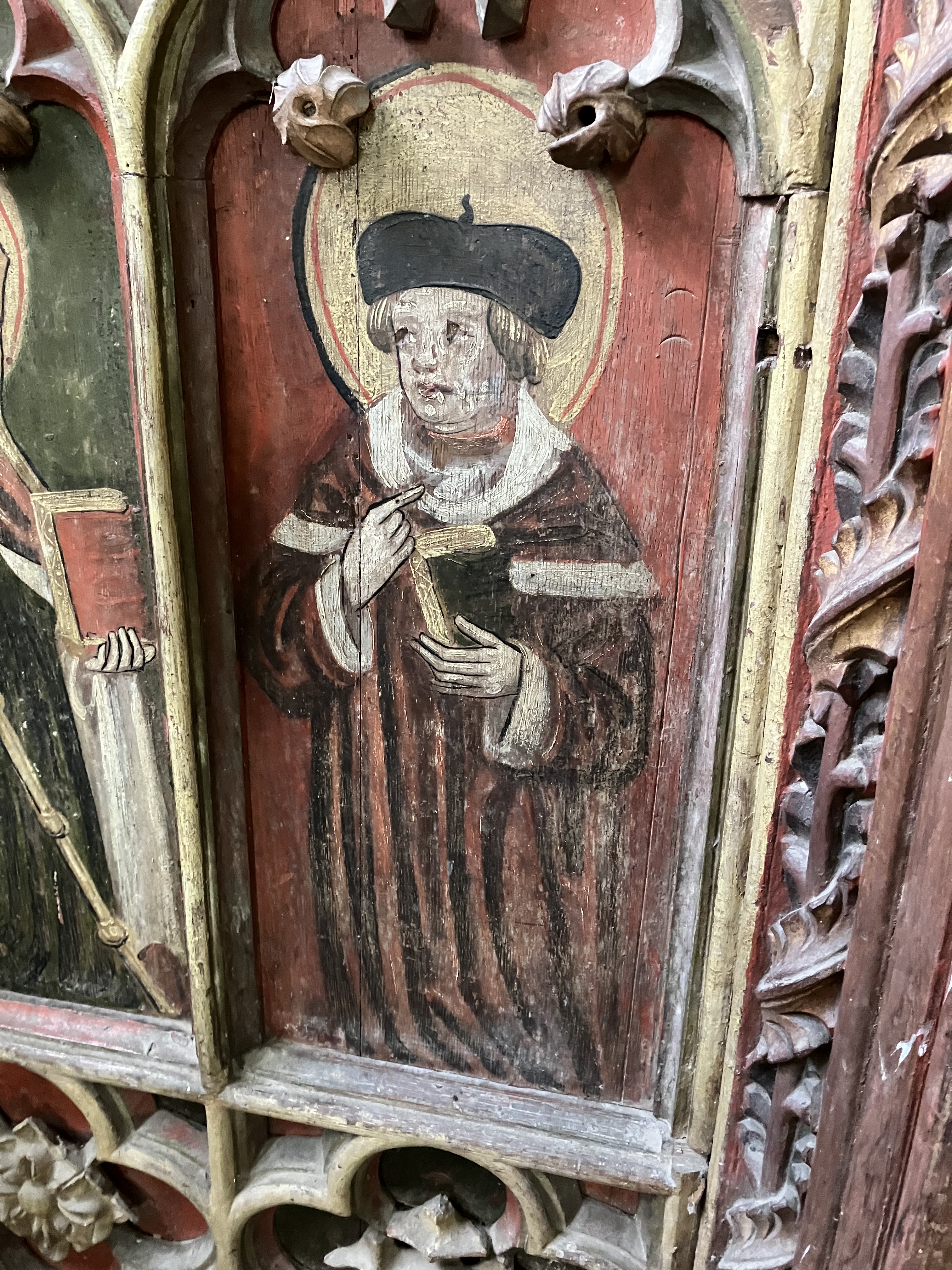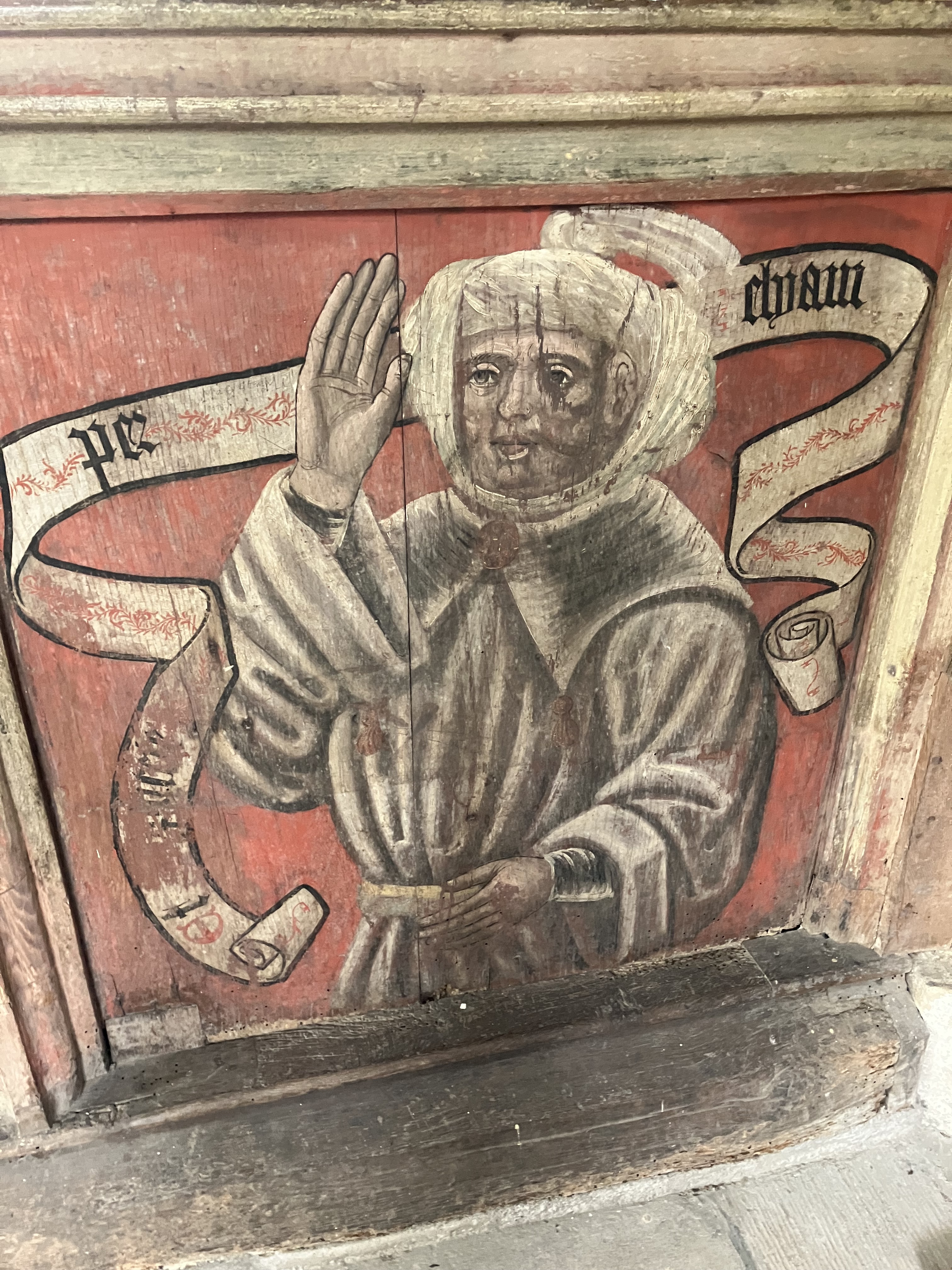 Equally atmospheric, because they are precious survivors, are the medieval screen paintings in Ashton Church of St John the Baptist, among Devon’s best, deep in beautiful countryside some 6 miles SW of Exeter. There are 32 saints, some disfigured, including St George and the dragon.