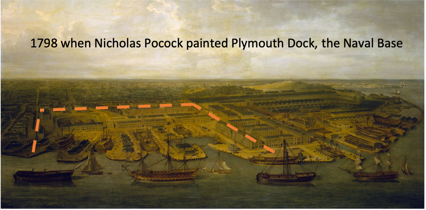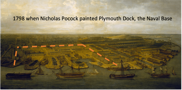 For the next 125 years, through 9 successive wars from 1688 to 1815, the strategy of the Royal Navy in this ‘Age of Fighting Sail’ was centred around a major repair yard, with stores, ordnance yards, fitting out basins and dry docks, in the military complex of Plymouth Dock and a Fleet Anchorage in Torbay, protected by the 3 forts and batteries established by the coast path at Berry Head, Torbay.