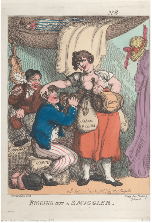 Between 1784 and 1792, Prime Minister William Pitt invested £64.5 million, about £50bn in today’s money on Defence. (By comparison the entire UK Defence budget in 2022 was £46Bn). At a time when the annual gross domestic product (GDP) was about £22 million in today’s money. These colossal sums were borrowed. Britain evolved the most sophisticated financial system in Europe. The Bank of England established in 1694, under William and Mary to fund the first of these French wars, allowed the Government to outspend a far richer French economy, because the national debt was guaranteed by Parliament which set taxes. The tax take had to rise to pay the interest and eventually pay down the national debt. Taxes were established on luxuries – especially tea, initially set in 1690 at 2 shillings a gallon on liquid tea brewed and sold in coffee-shops. By 1784 all tea imports were taxed at 120%. Taxes were also imposed on spirits, tobacco, and lace. Inevitably this led to a thriving smuggling trade. Rudyard Kipling caught the popular romance of the smuggling trade in his 19th century poem, but as Thomas Rowlandson’s 18th century engraving shows the ladies were far from innocent.