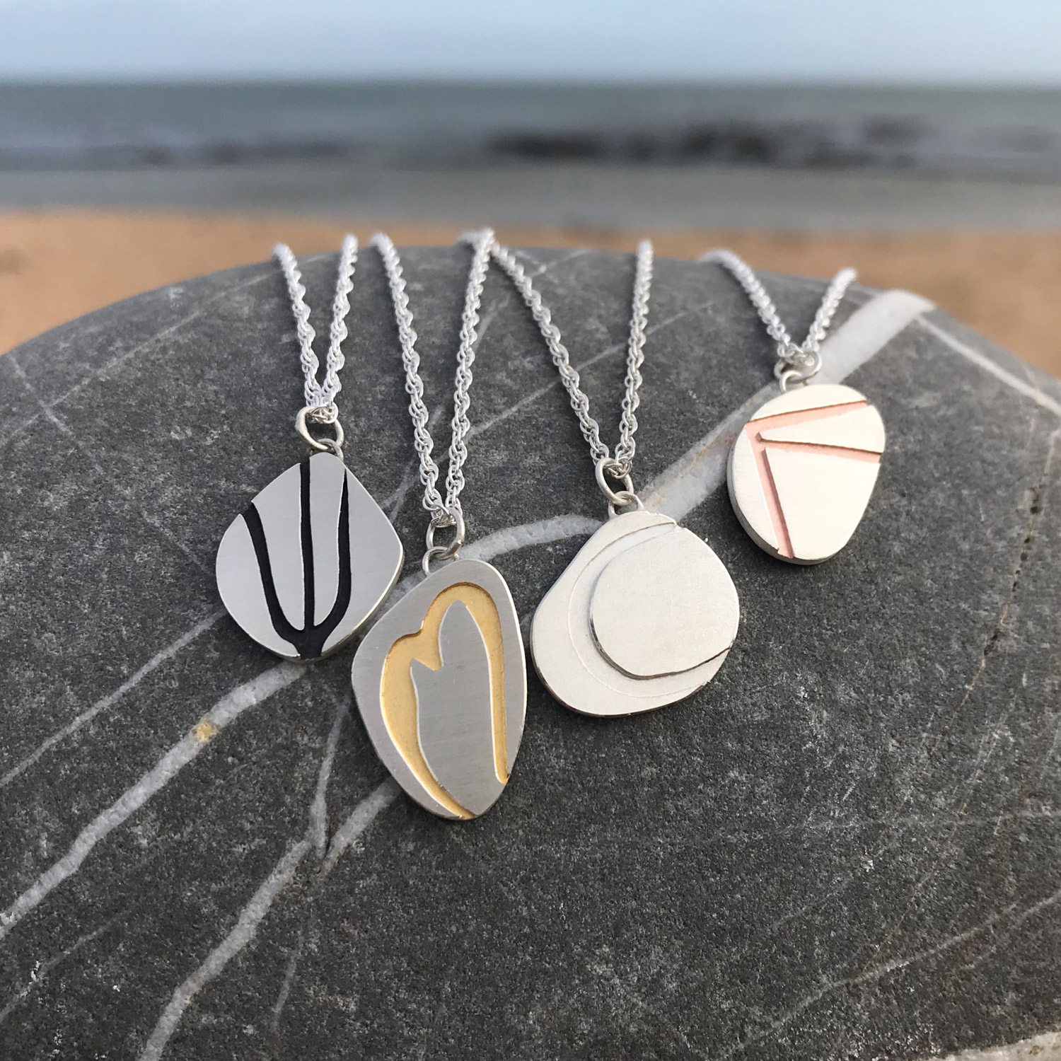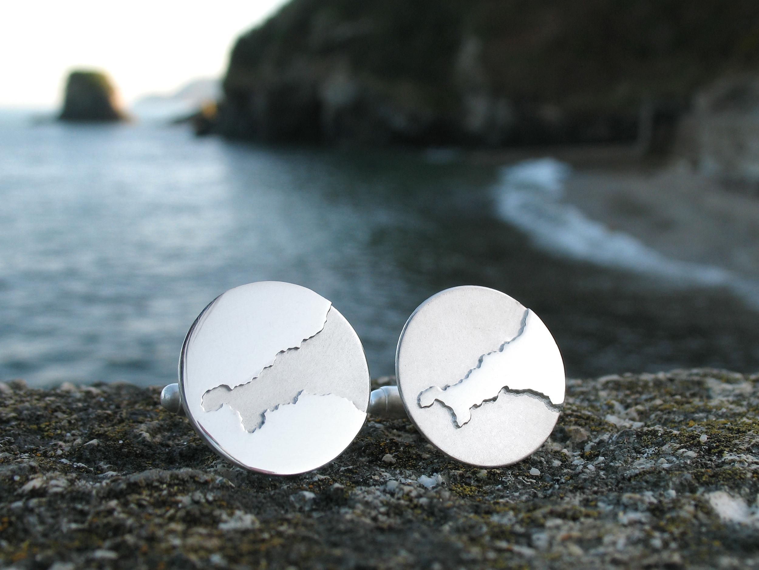 The biggest influence on my designs is undoubtedly the Cornish coast. When I was making jewellery just for me, or for my degree and exhibitions, it was all based on my experience of growing up by the coast. From the rugged cliffs to the tranquil beaches, I translated those inspirations into silver, cutting intricate maps and coastlines from silver then using elements of patinated metals to evoke the colours of the coast. There was a real sense of place to my collections and as my work evolved, I found that, like me, everyone has a special coastal memory. Now, each design I make is a reflection of the stories and memories shared by my clients, celebrating the connections they have to the coast.