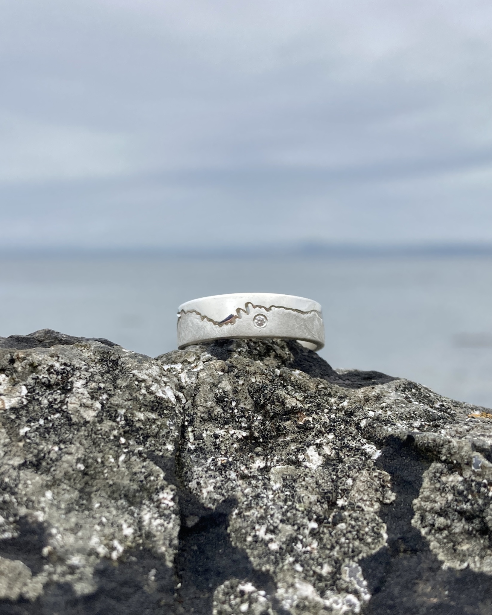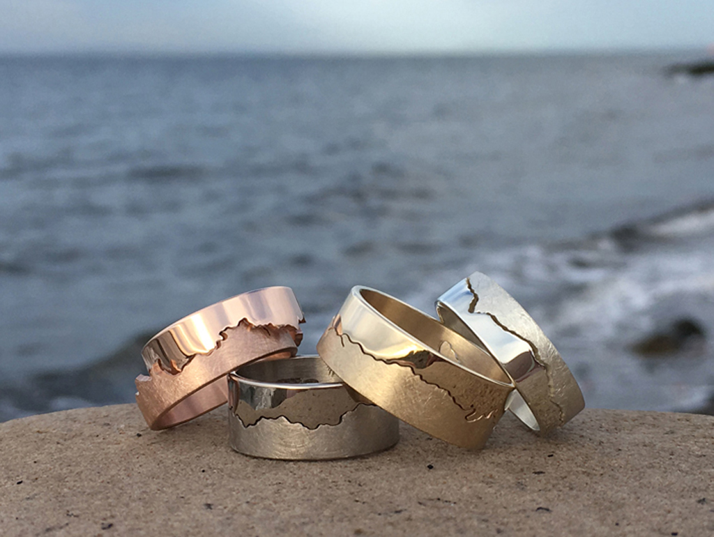 My collections have evolved organically over time, with 99% of my work being bespoke and personalised to a piece of coastline, mountain range or skyline that person holds dear. My most popular collection is my two-part coastline rings, each carefully hand cut so one half reflects the land and the other reflects the sea. Each ring is crafted with precious metals with optional diamonds to mark special spots along the shore. My latest collection is inspired by beach pebble’s marks and lines reflecting an entire alphabet. Iโve recreated each pebble into silver letter pendants and cufflinks and they have quickly become a customer favourite.