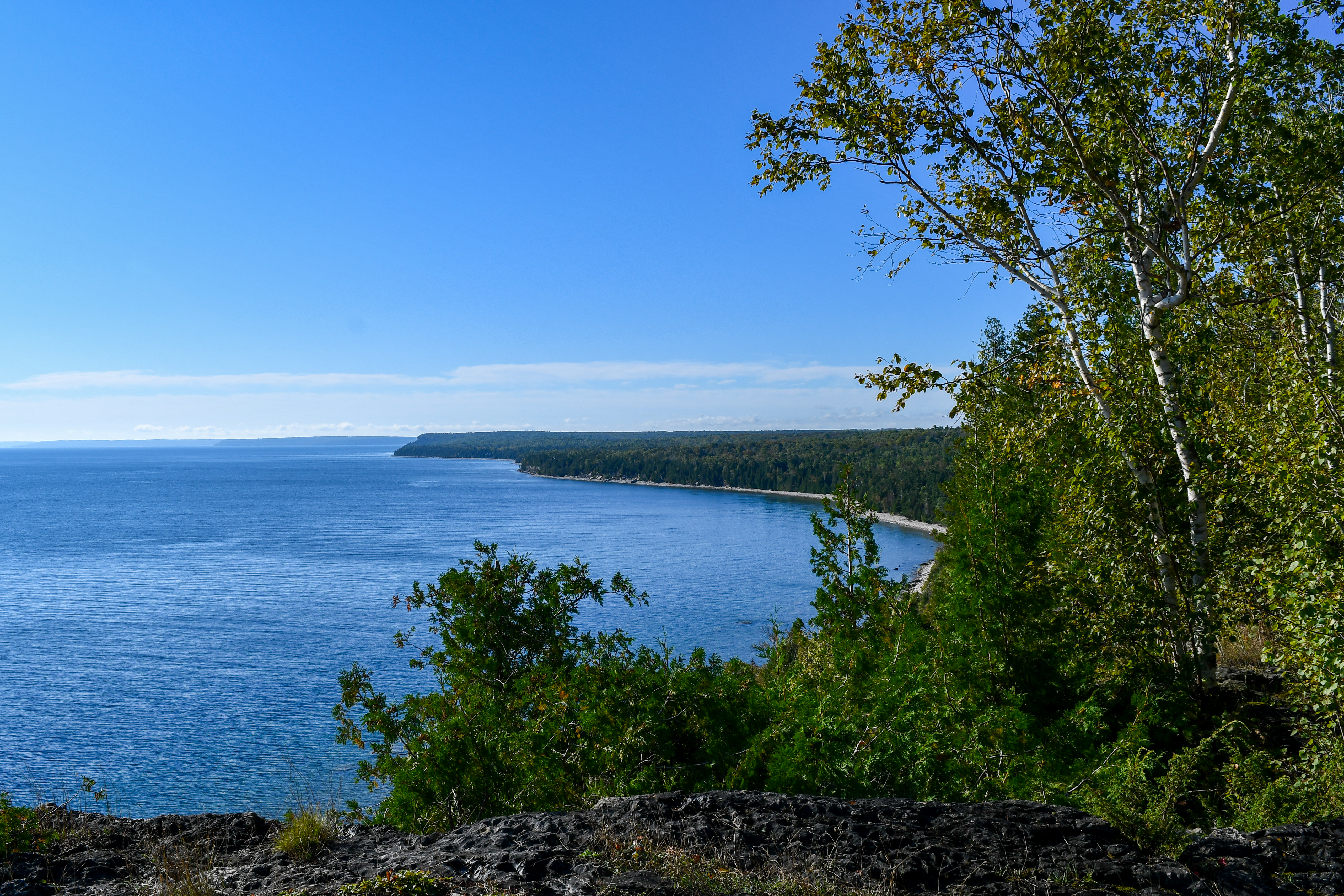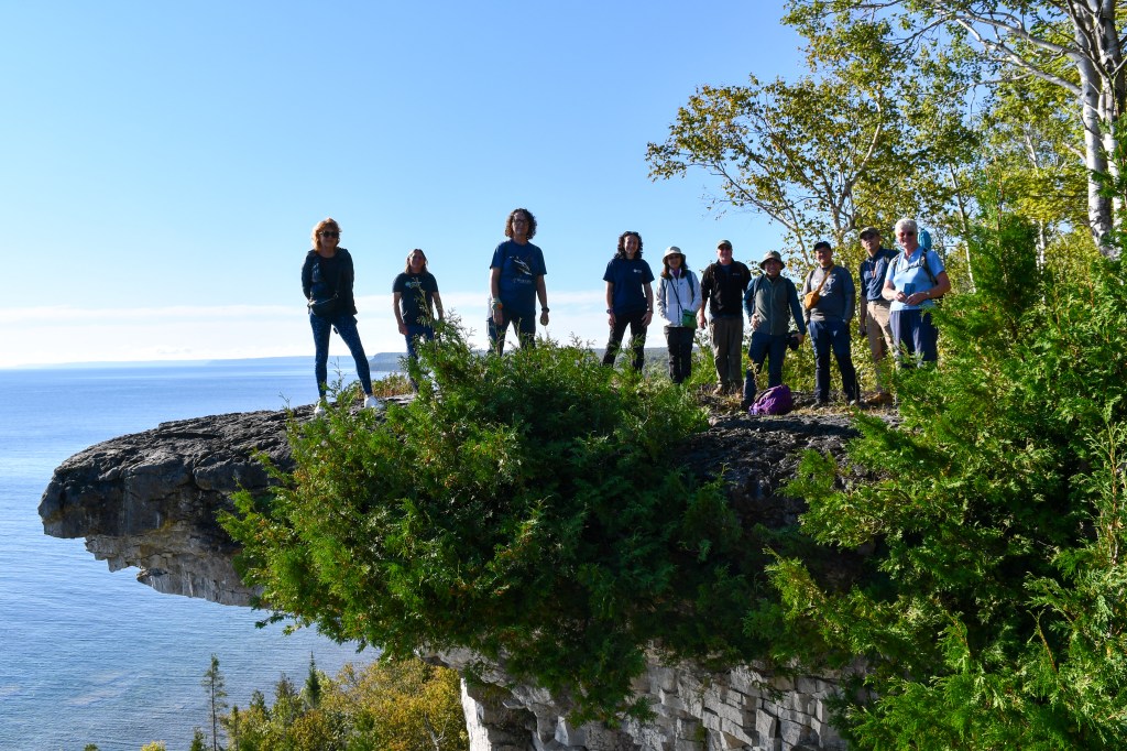 The starting point for our Friendship Trail was Cape Chin where we were meeting up with the volunteer team which looks after the Peninsula section of trail. We drove down a long track and the Bruce team explained how they had recently purchased this area of land to protect the route of the trail and importantly conserve and improve the land for nature. As we pulled down to the end of the lane it suddenly opened out into breathtaking views across the Georgian Bay, a huge expanse of water that you cannot see to the other side. Even though it is part of a lake system the sound of water lapping up onto the shore instantly brought our senses back to being stood on the SWCP.
