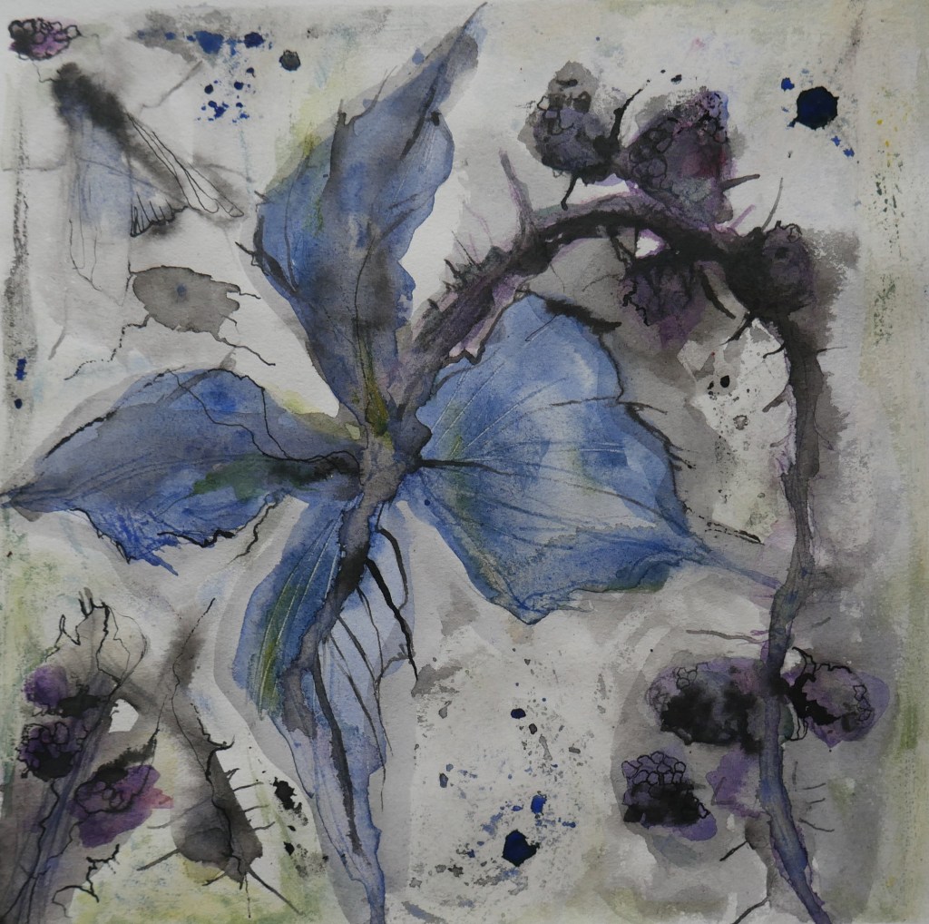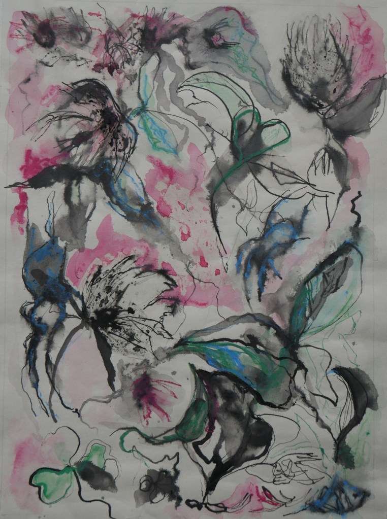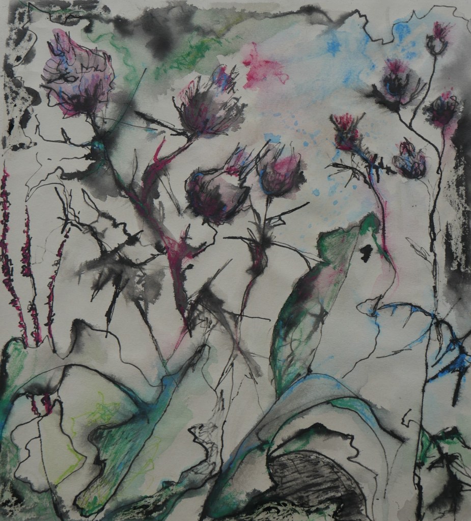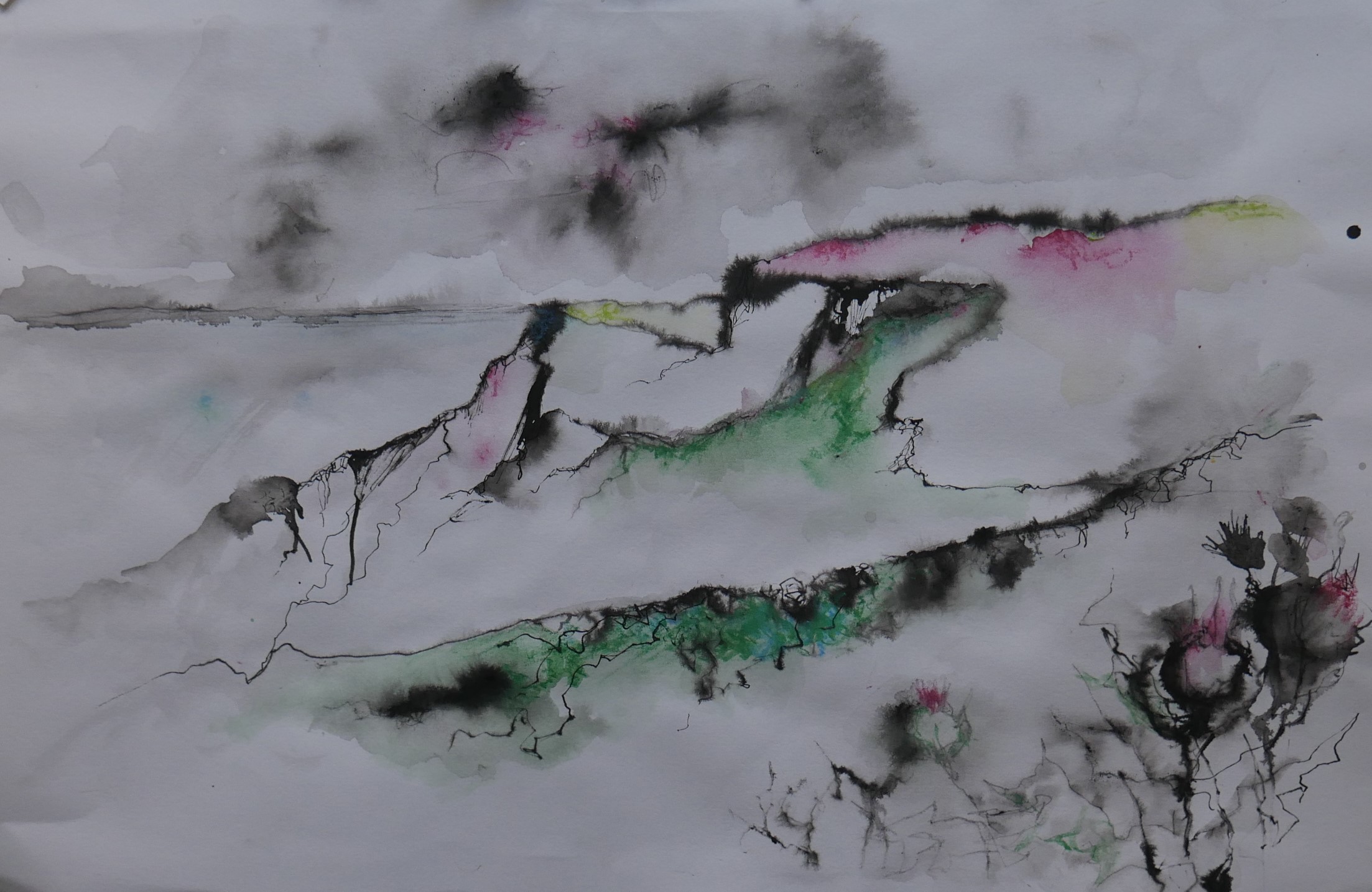A drawing or painting is an expression of feelings about my environment that I can’t express in language. The process of making a mark on paper begins an articulation of deeper thoughts about what it is to be human. My art follows the Seasons. I draw and paint what I see around me in the moment, often from life, combined with imagined forms and colours. I use sticks or feathers and other found objects, that I collect when out walking, to apply paints and inks. Moody weather and rough seas can stir up emotions in me and then I want to paint them.