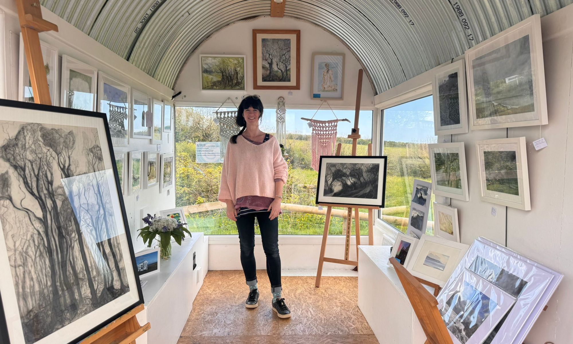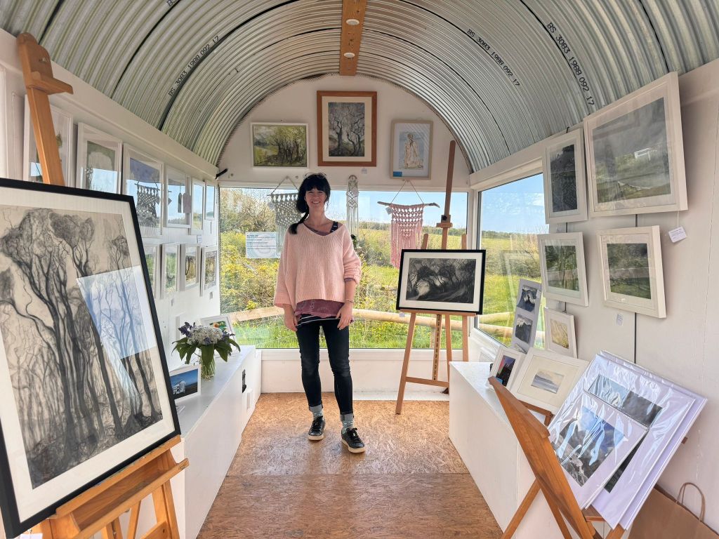 I am extremely fortunate to be surrounded by the wildness of North Cornwall. This habitat suits the creature in me! My subject matter is in the fields, cliffs, trees and skies of the Coast Path which passes through the small hamlet, where I live. Walking has a meditative effect on me and I have some of my best ideas out on the cliff path. Being able to sketch and paint out in the elements is an adventure and a privilege. Looking from a distance in my art studio, I see walkers with big backpacks following the way. I wonder how they feel and I make art from these figures in the landscape.