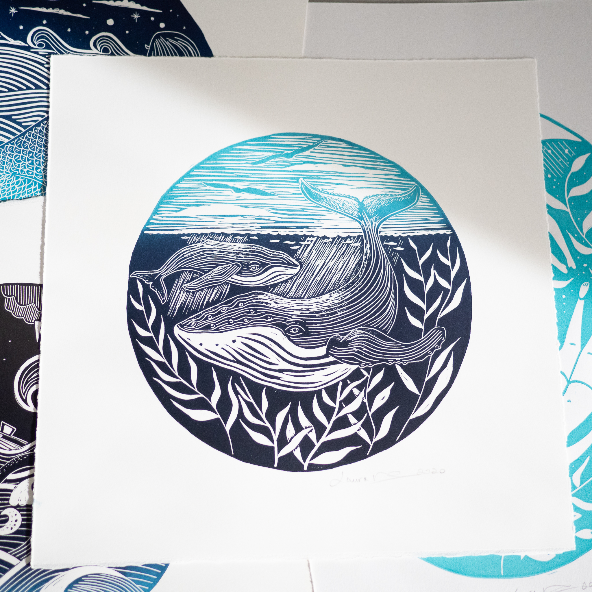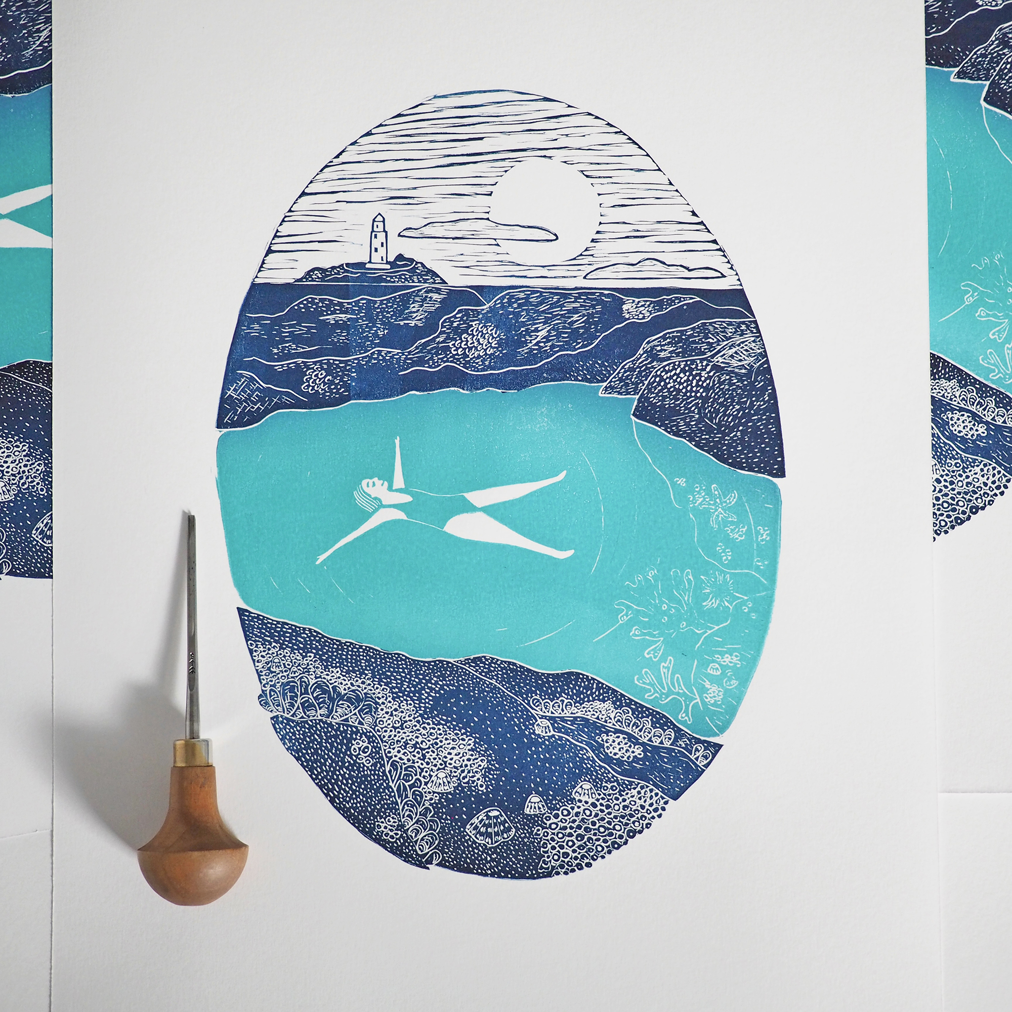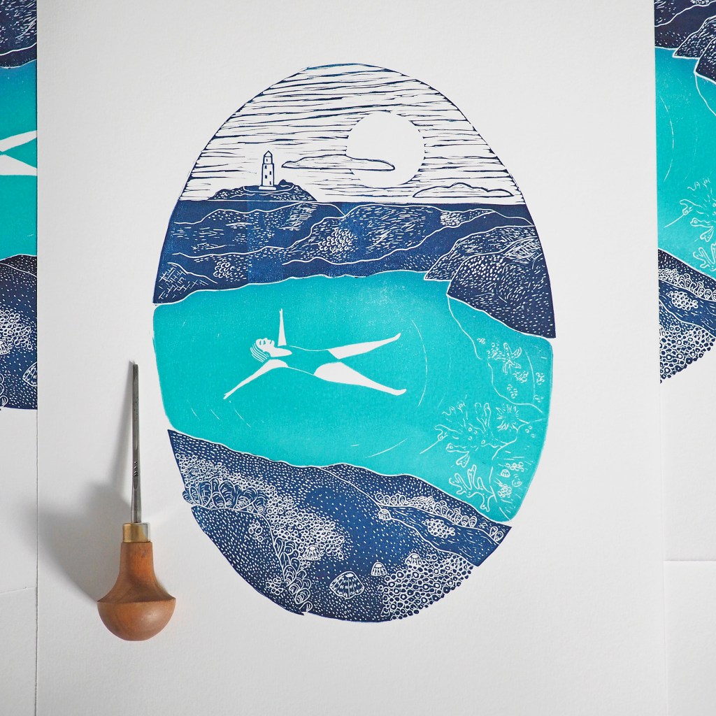 Printmaking is the antidote to the current need for instant gratification. It’s a slow, mindful practice that can’t be rushed. I will initially sketch out my design and play with the composition until I’m happy with the final image. I’ll then trace the image and transfer it onto a lino block and carve away the negative space to produce the final design. The block is then inked up and the image printed using my press. Prints can be made from a single block and colour, or the lino can be carved and printed multiple times to create a multi colour reduction print. This process takes far longer and really is a true test of patience! There is something magical about seeing the finished print for the first time after you’ve been working on it for weeks.