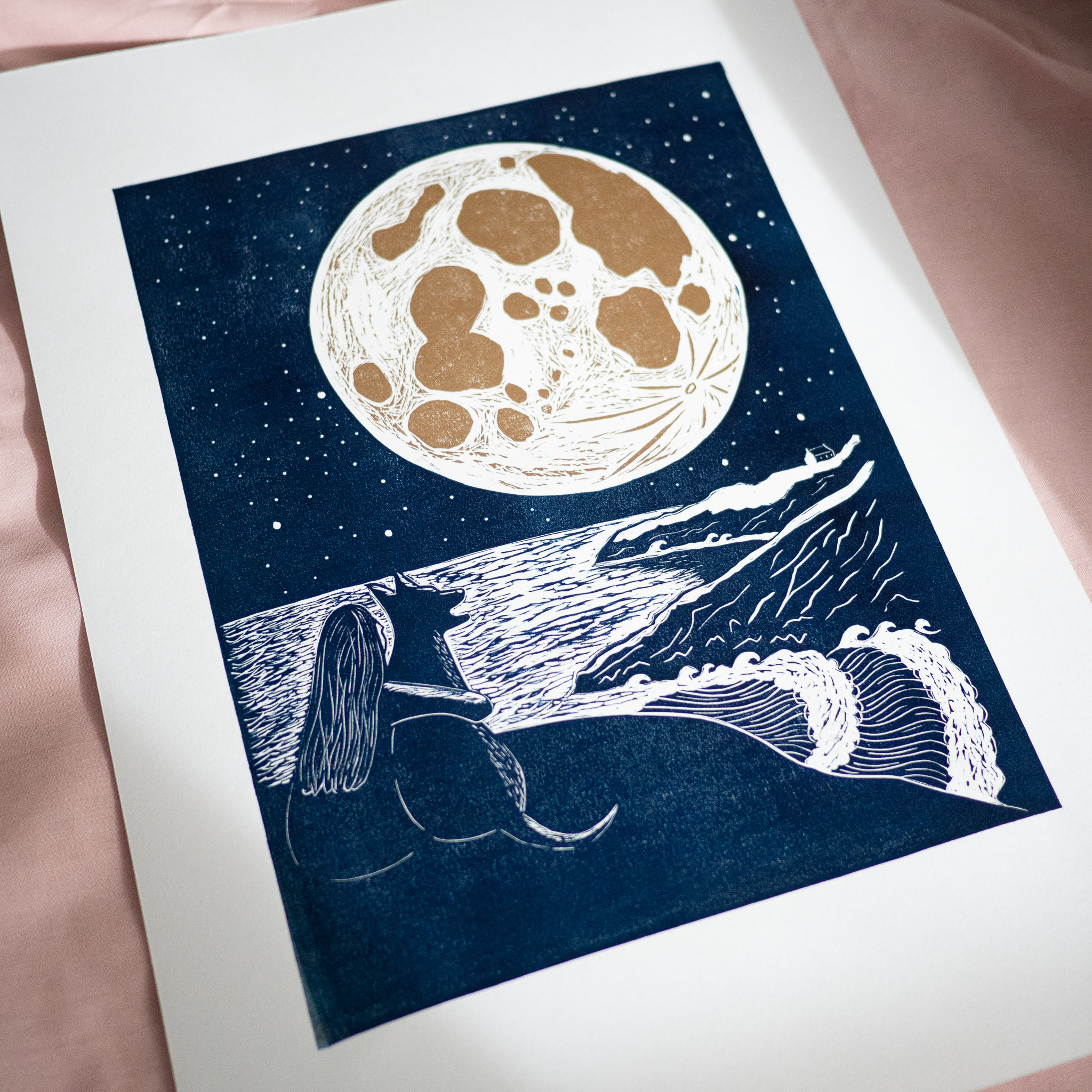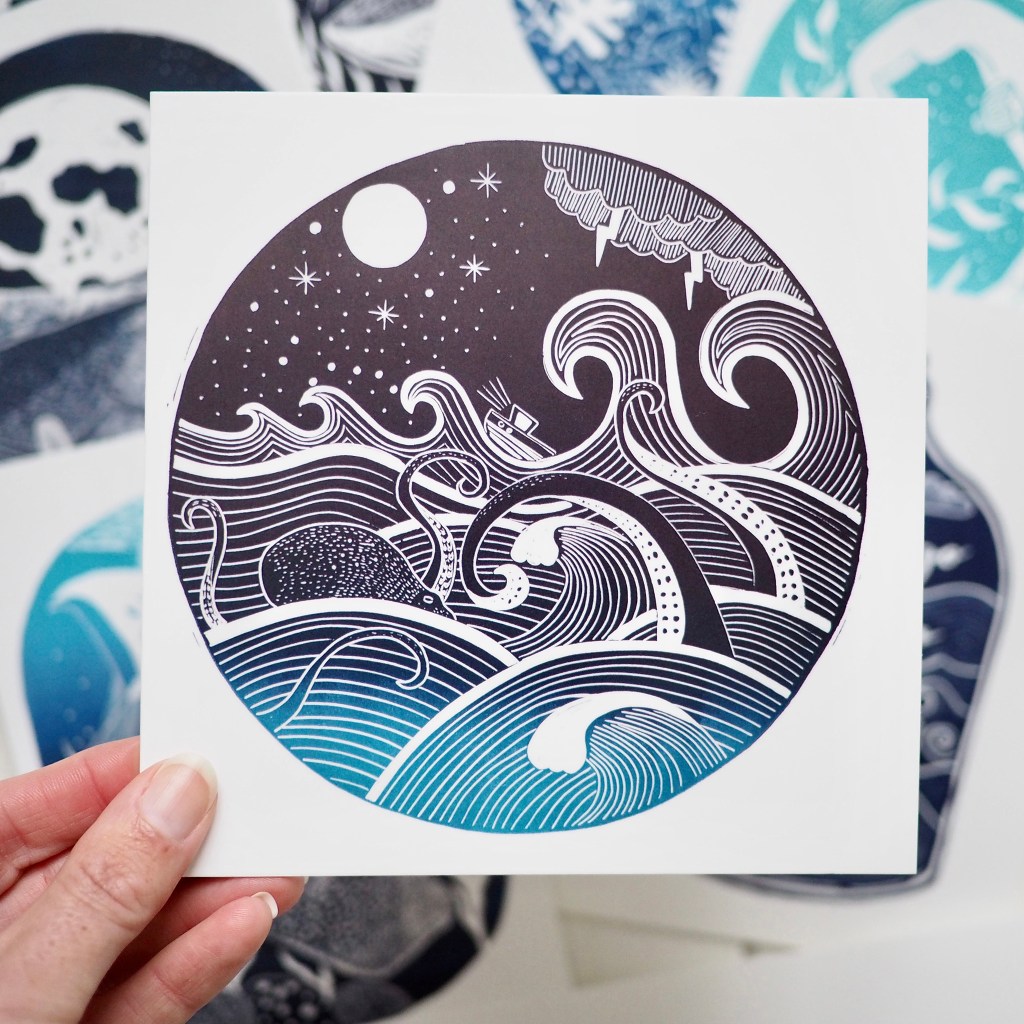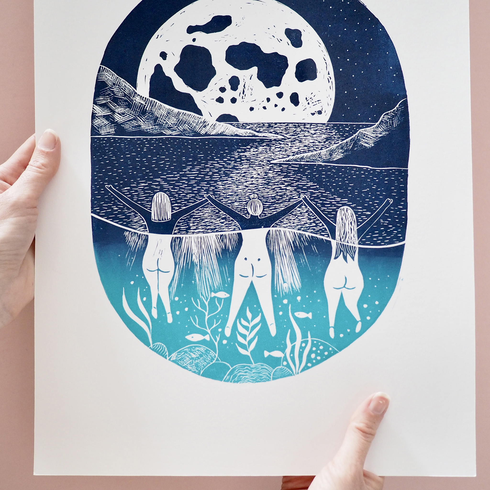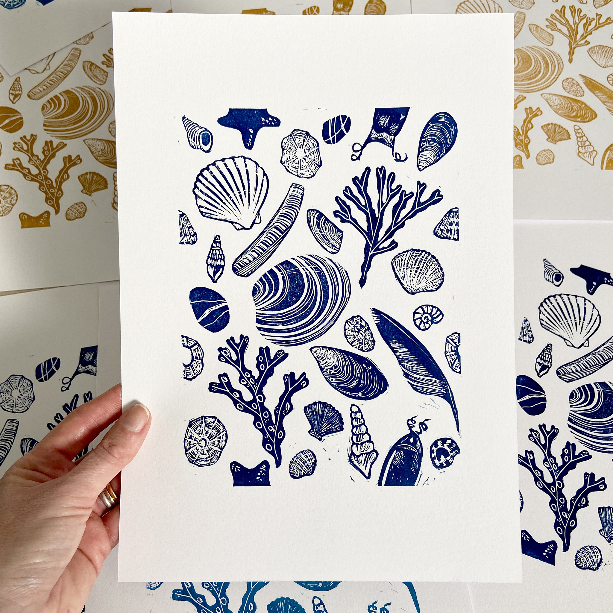Printmaking is the antidote to the current need for instant gratification. It’s a slow, mindful practice that can’t be rushed. I will initially sketch out my design and play with the composition until I’m happy with the final image. I’ll then trace the image and transfer it onto a lino block and carve away the negative space to produce the final design. The block is then inked up and the image printed using my press. Prints can be made from a single block and colour, or the lino can be carved and printed multiple times to create a multi colour reduction print. This process takes far longer and really is a true test of patience! There is something magical about seeing the finished print for the first time after you’ve been working on it for weeks.