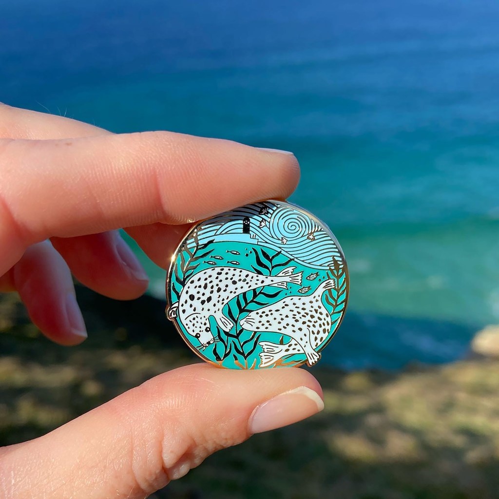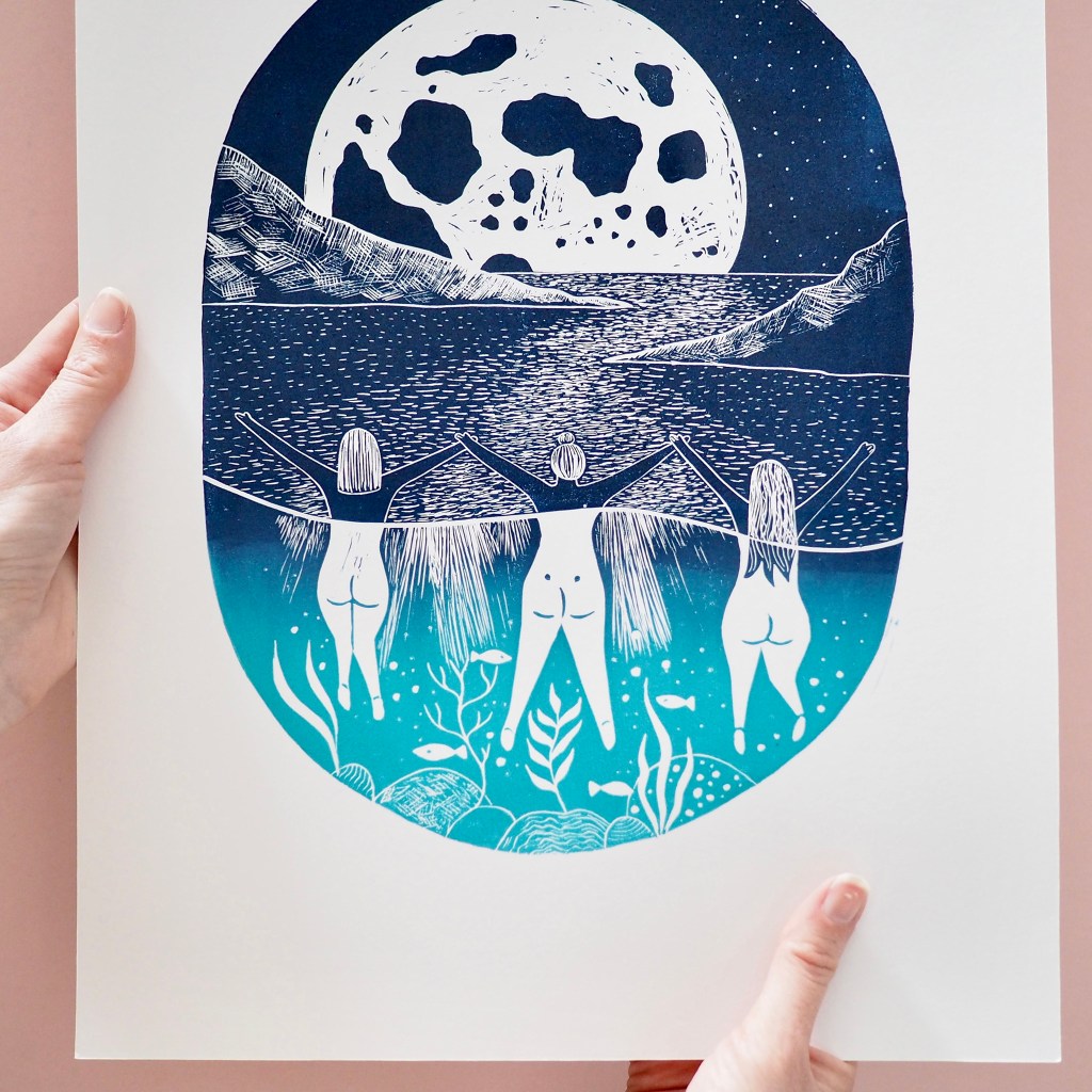 When I’m time restricted I will pick up my iPad and create digital prints; this gives me the freedom to play with colour and texture. I will often create something digitally and then think to myself ‘I wonder if I can recreate this as a lino print?’. I like that challenge. I also love the process of transforming my prints into usable items such as enamel pins, mugs, and even swimwear.