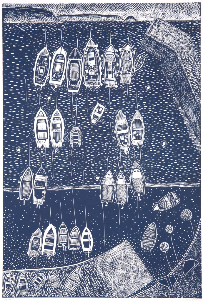 I never thought Iโd leave Cornwall – itโs in my soul and in my blood. However, as a young man I found work in Oxfordshire as a busy photographer, which (despite being rather landlocked!) I have enjoyed very much. My printmaking was a hobby (I canโt sit idle) and became a medium for me to connect with my homeland, through carvings of fishing boats, harbours, crabs and the coastline. Now, my printmaking has taken the front seat and in a wonderful full circle, the popularity of the prints has enabled me to return to live in Cornwall. Itโs an absolute dream to finally โcome homeโ to the Helford area and there is no doubt that my Cornish prints have enabled us to make this move – drawing us back to where we belong. It feels like fate.โฏ