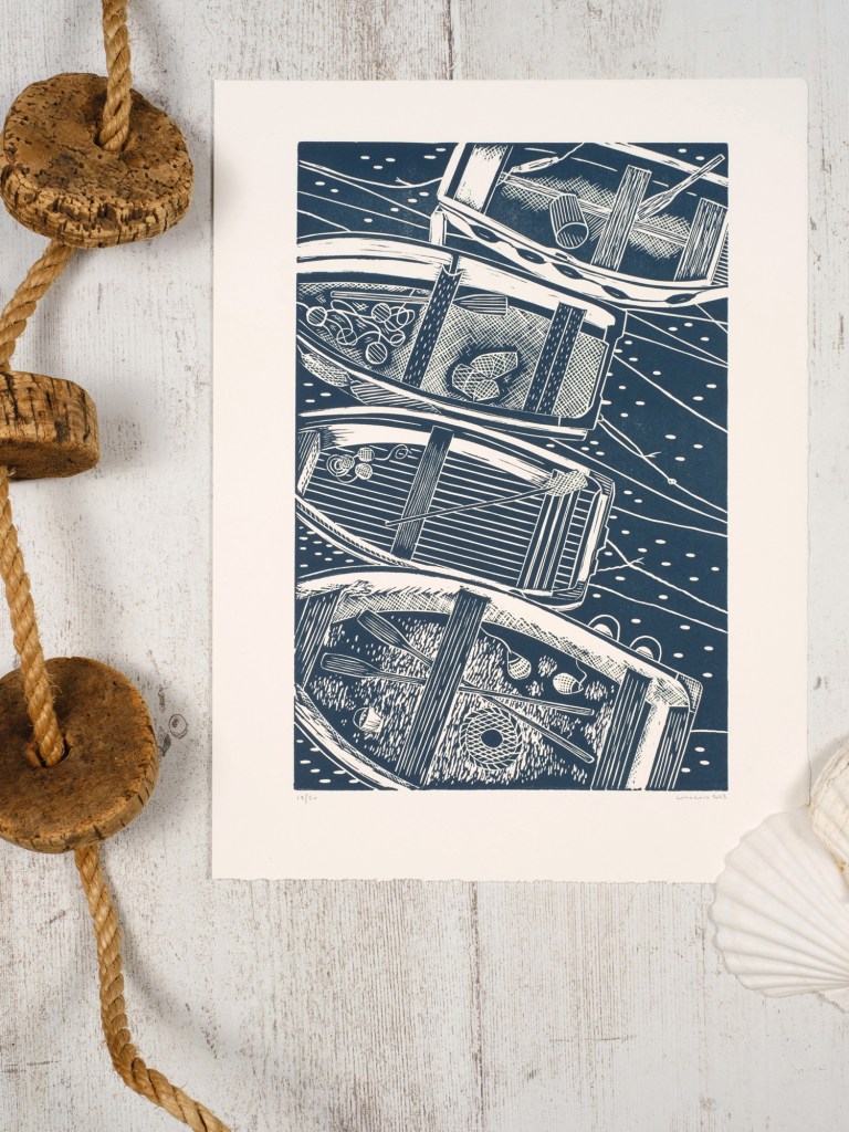 When I picked up my first lino block back in 2019, I carved a picture of our little cat Lottie, asleep on the bed. Very soon though (with 2020 keeping us all at home and apart from loved ones) I was drawn to images of my homeland, โsnapshotsโ of Cornwall and the coast, a part of the country that means so very much to me. I do dabble in prints of iconic retro classics, such as record players and also enjoy capturing veg from our allotment (my artichoke print is a bestseller) but my heart is forever captivated by the Cornish coastline and those who make their lives next to and on the water.โฏ