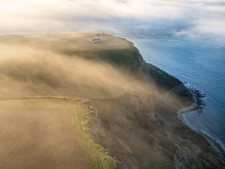 This image was captured early on Boxing Day morning 2024. Wanting to walk off some of the excesses of Christmas Day I ventured out to a favourite local spot to try and get above the grey cloud and mist that was shrouding most of the local area. Thankfully for a short period of time there was enough of a gap to allow the drone to fly and capture this scene with the early golden light catching the mist rolling over the headland and cottages which in my eyes creates a fairly unique scene. The image was captured on my DJI Mavic 3 pro drone.