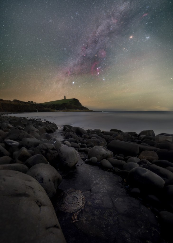 Determined to find the perfect fossil for my composition, I spent over an hour carefully searching the boulders and stones left exposed by the receding tide. To my delight, I eventually discovered a beautifully preserved ammonite, which aligned perfectly with Clavell Tower and the stars above. I used a Nikon D810A, a camera specially designed for astrophotography, and wide-angle lens to capture the photograph blending five 180-second exposures for the foreground with five 120-second tracked exposures for the sky, all taken from the same location on the beach.