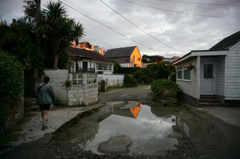 The picture was taken in Polzeath on the way from our campsite (Robbie Loves Camping) towards the beach in the evening. I don’t know the exact time. It was shortly before sunset. It was a quick picture, because I noticed the water on the street late. My friend Johanna is walking in front.