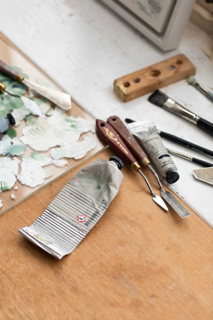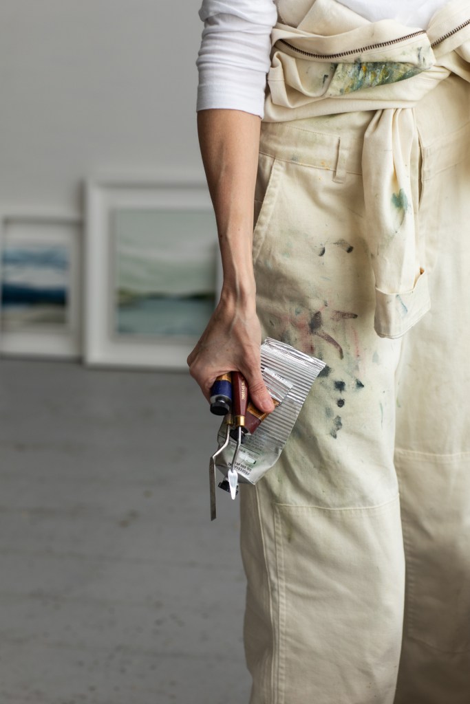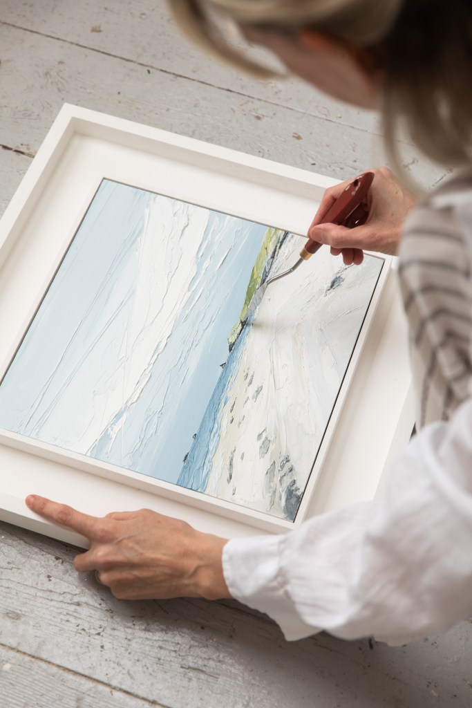 I primarily work with a palette knife and oil paints, using an impasto technique to build dimension and contrast in my pieces.โฏ The palette knife is the ideal tool for capturing the rough texture of cliffs, the rolling waves and wind-stirred grasses.โฏ I love the buttery consistency of oil paints, they are the perfect medium for applying in thick, textured layers and create raised, tactile surfaces which catch the light and cast tiny shadows, bringing the painting to life.โฏย