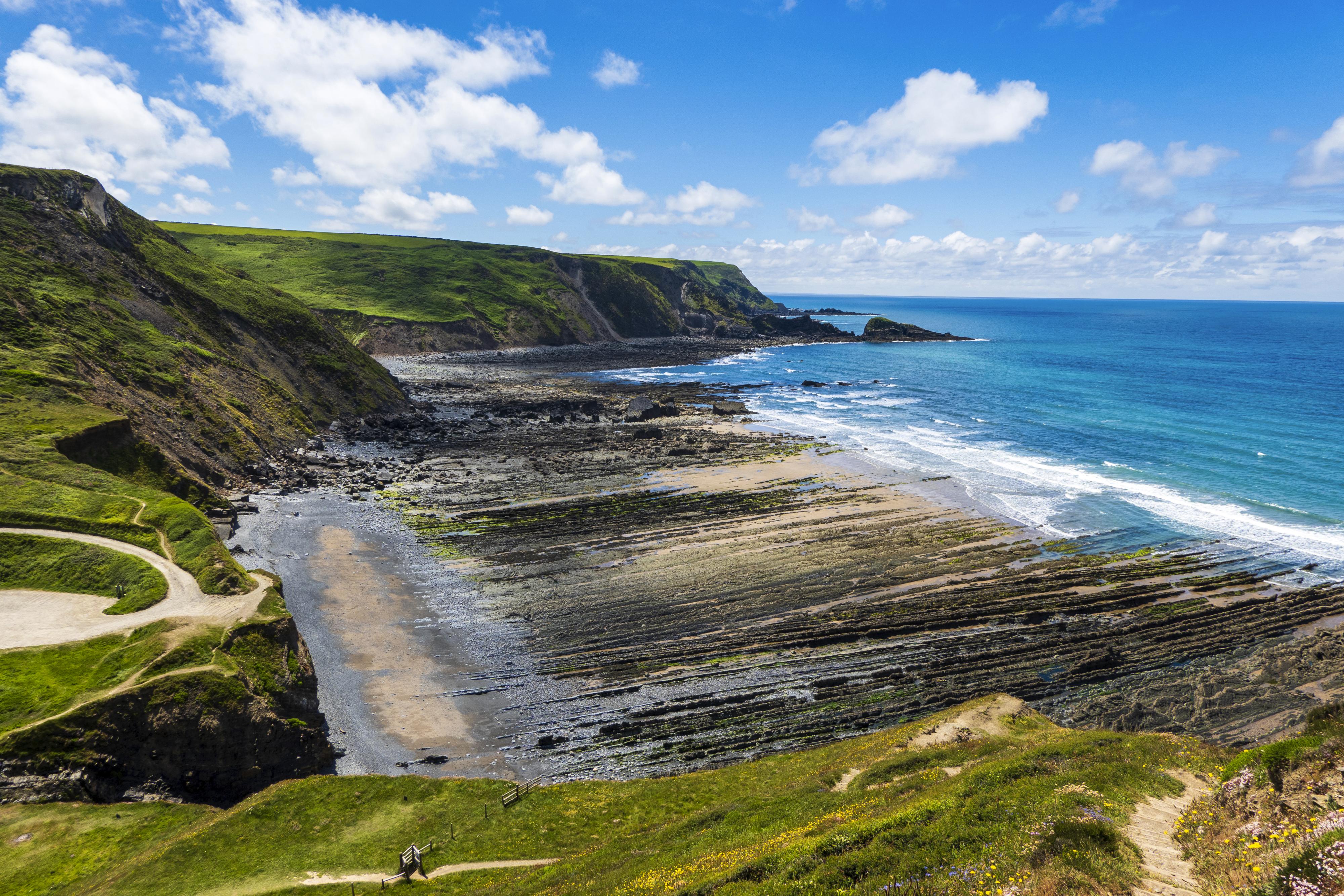 Often described as the toughest section of the South West Coast Path, this dramatic day involves a series of ten steep, deep river valleys, a relentless rollercoaster that demands stamina but rewards in spades, with tumbling waterfalls, secluded combes, and far-reaching sea views. From Hartland Quay, the trail climbs behind St Catherine’s Tor before following the cliff edge to Speke’s Mill Mouth, where a spectacular 157-foot waterfall crashes down in three tiers before running into the sea. A little further on, cross a wooden footbridge and choose your route: either keep to the cliff-top over Swansford Hill or detour inland up the valley before rejoining the path. Look out for a small hut, once used by playwright and poet Ronald Duncan, furnished with benches, a desk, chair, and a visitor’s book. Continue over Vicarage Cliff, where you’ll pass Hawker’s Hut, a tiny driftwood shelter once frequented by eccentric vicar-poet Reverend Robert Hawker. It’s now the smallest property in the National Trust’s care. Beyond here, the path crosses into Cornwall at Marsland Mouth, the official county border, before dropping into Welcombe Mouth, a dramatic, rocky beach with rich geology and rock pools revealed at low tide. Continue up and down the river valleys, passing landmarks like Elmscott Church, the radio dishes, and Duckpool Bay, a wild beach reached via a wooden footbridge. From Sandy Mouth, the path gradually begins to ease, following the coastline through Northcott Mouth and over the open clifftops of Maer Down. Finish at Crooklets Beach, with its colourful beach huts, then stroll the low cliffs behind the town’s beaches to your destination in Bude.