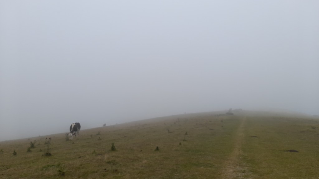 As we walked along the top of the ridge it was quite eerie, the cloud was so low that the usual beautiful view across Poole Harbour was completely obscured, and we could only just see Swanage Bay on the other side. The cattle that graze the hillside, helping to maintain the habitat, loomed out of the mist as we approached, but took no notice as we walked past. These cows and their calves are so used to people that they donโt mind the walkers up here whatever the weather. One young calf had managed to get itself stuck the wrong side of the fence, and was calling to its mother who was calling back loudly from the other side. Our group managed to gently herd the calf to a gate and held it open so it could run back through and rejoin its mother.