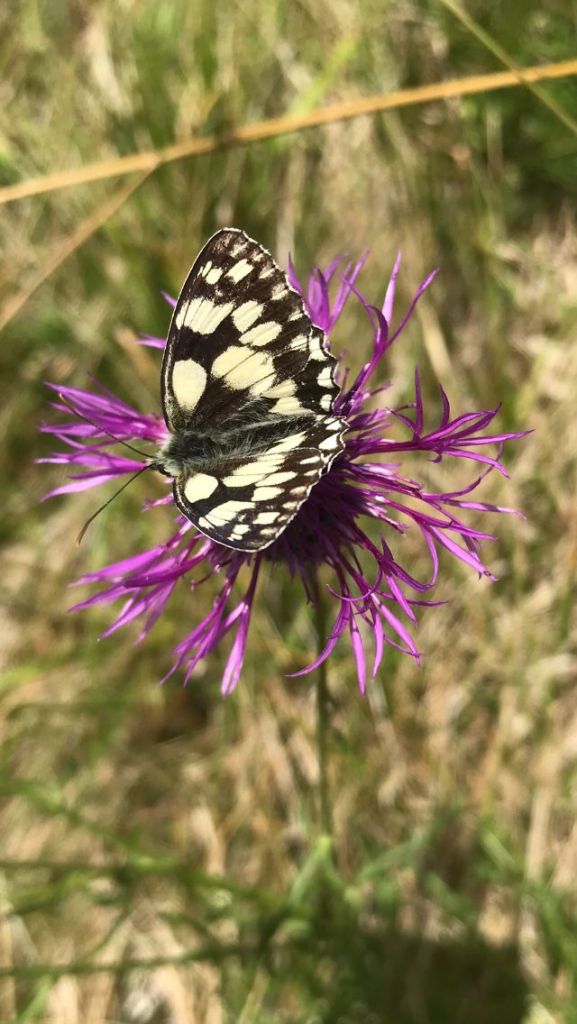 The footpath along the lower part of Ballard Down passes some of the most beautiful flower-rich grassland in the area. Knapweed, field scabious, ladyโs bedstraw and birdโs-foot-trefoil were all in full flower, and suddenly there were butterflies everywhere we looked! Large skippers, gatekeepers, large whites, ringlets, small heaths and a single common blue joined the small skippers and marbled whites racing across the meadow. Along the hedgerow bordering the path we also saw peacocks and speckled woods, while a comma sunbathed on the path in front of us, landing on my leg briefly before flying on.