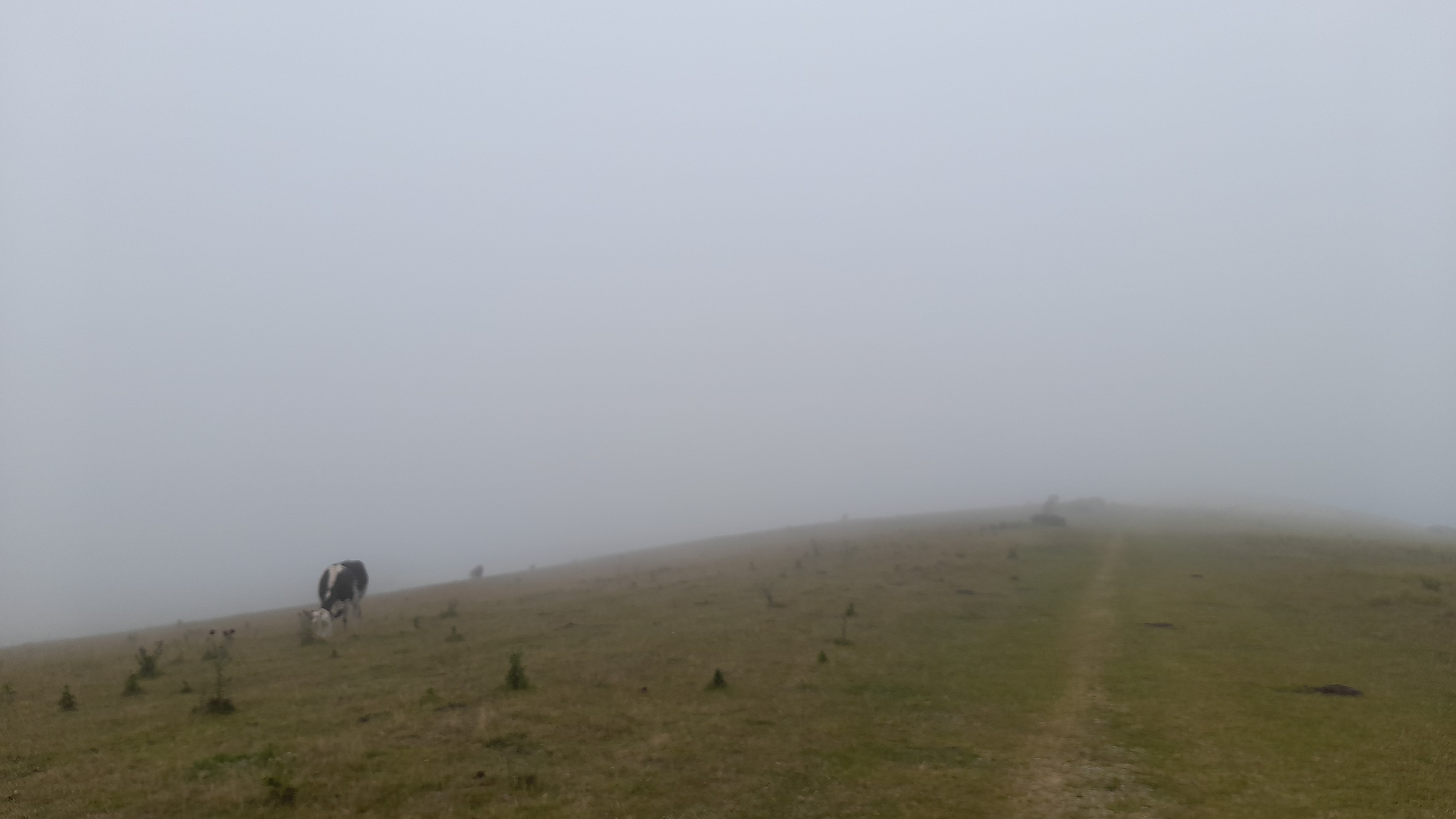 As we walked along the top of the ridge it was quite eerie, the cloud was so low that the usual beautiful view across Poole Harbour was completely obscured, and we could only just see Swanage Bay on the other side. The cattle that graze the hillside, helping to maintain the habitat, loomed out of the mist as we approached, but took no notice as we walked past. These cows and their calves are so used to people that they donโt mind the walkers up here whatever the weather. One young calf had managed to get itself stuck the wrong side of the fence, and was calling to its mother who was calling back loudly from the other side. Our group managed to gently herd the calf to a gate and held it open so it could run back through and rejoin its mother.