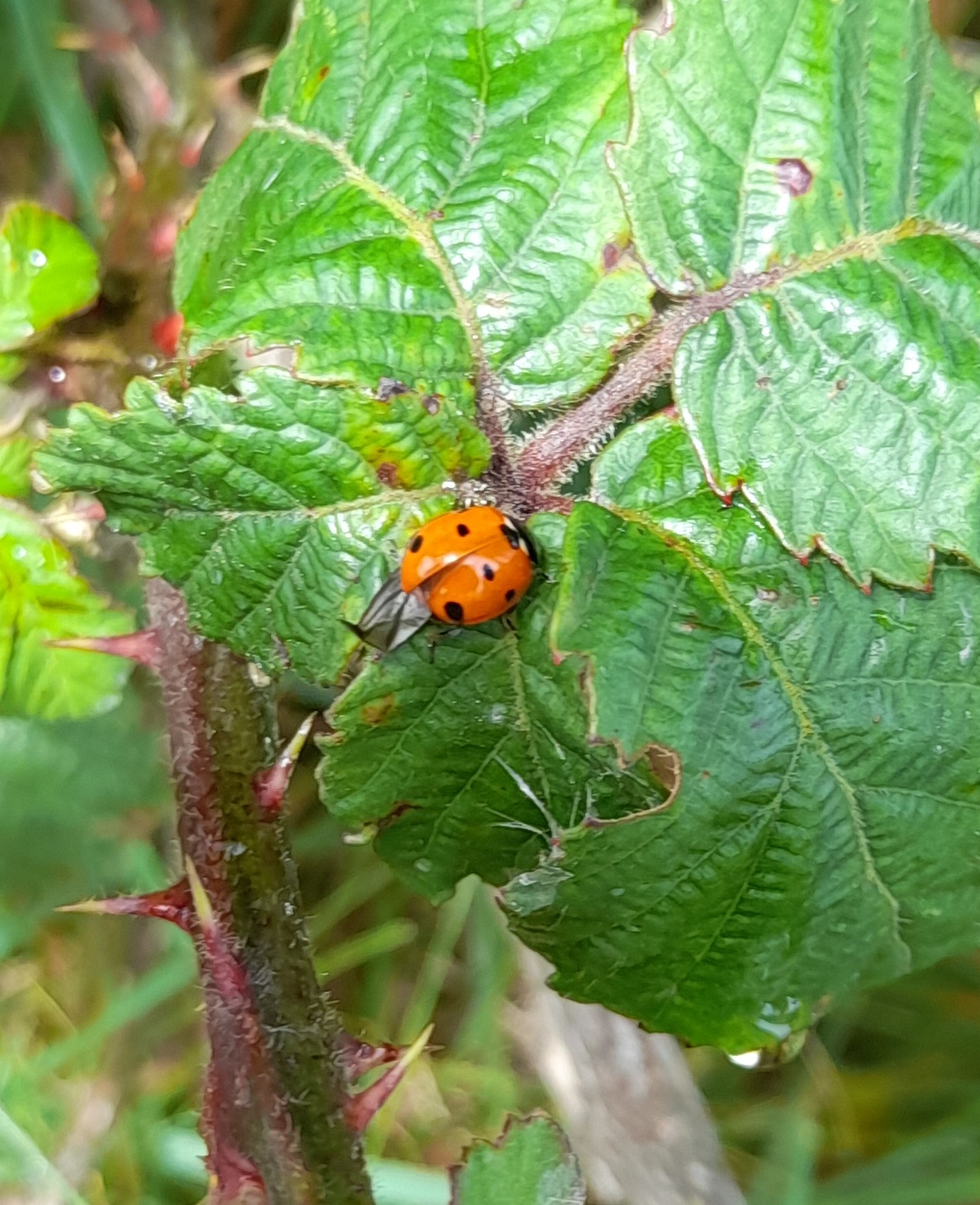 As we continued towards the sea, the cloud did begin to clear, and we started to see a few insects feeding on the thistle and bramble flowers; red admirals, bees and hoverflies. By the time we turned down the path along the side of the hill, towards the ungrazed lower slopes, the sun was starting to shine in earnest. The distinctive buzz of the Roeselโs bush cricket started to fill the air, and we were lucky enough to see both male and female crickets calling to each other. We also started seeing more butterflies; marbled whites, meadow browns and small skippers flying low over the grasses.