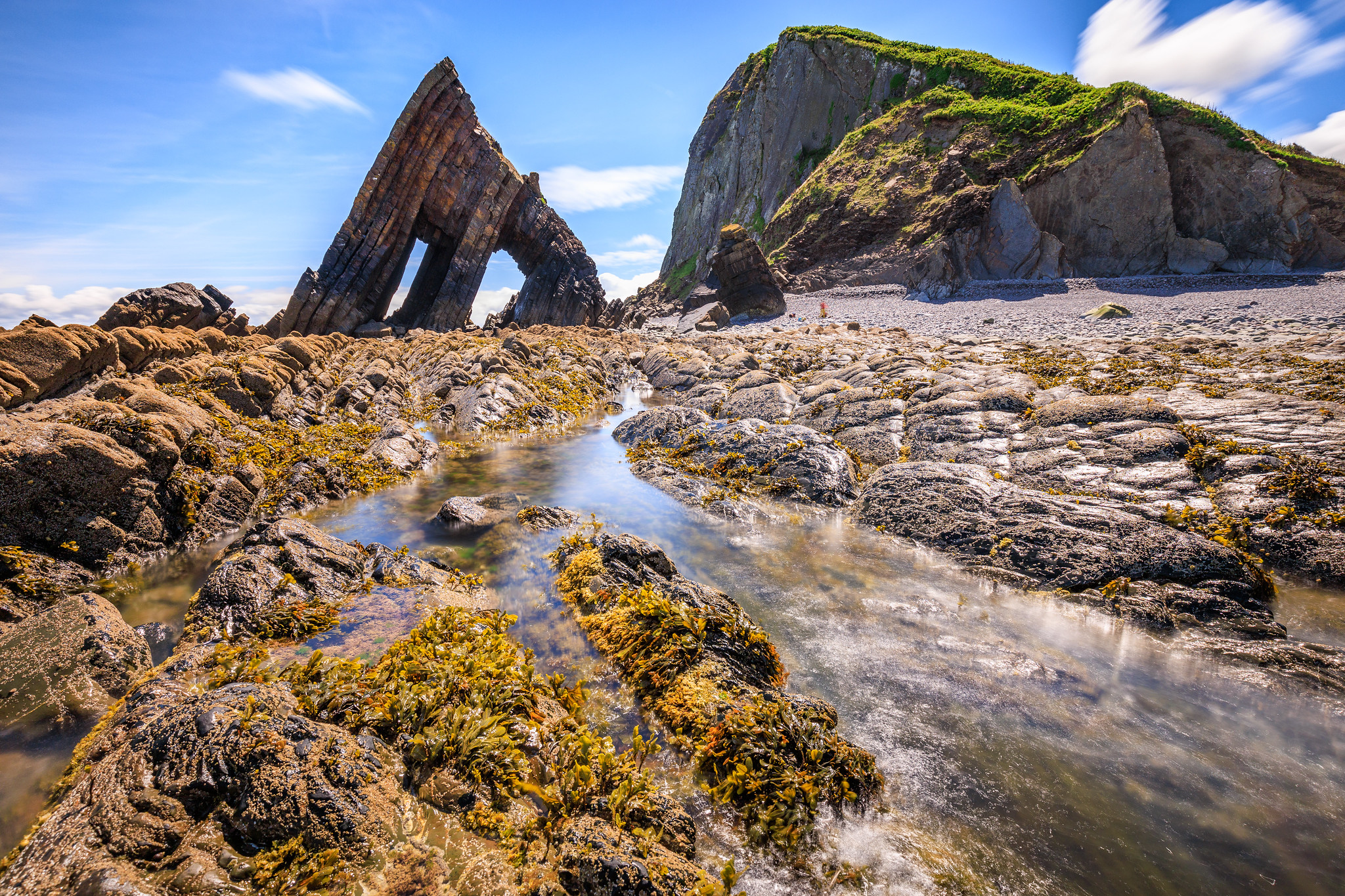 Step into a fairy-tale world on this enchanting stretch of the South West Coast Path from the timeless fishing village of Clovelly to the hidden cove of Mouth Mill. The cobbled lanes of Clovelly give way to wooded cliff paths with glimpses of the sea below. As you descend through the ancient woodland, the sounds of birdsong and waves guide you toward the pebble beach at Mouth Mill, framed by striking rock formations.