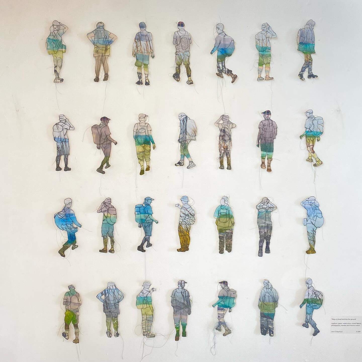 “There were so many things about Janeโs textile piece about walking that drew me in when I saw it in an exhibition. The piece reveals the careful study of individual hikers – all with their own stories; the reference in the title to a wonderful poem called Wild Geese by Mary Oliver; the frayed dropping threads of the hikers, like the lines of their lives.