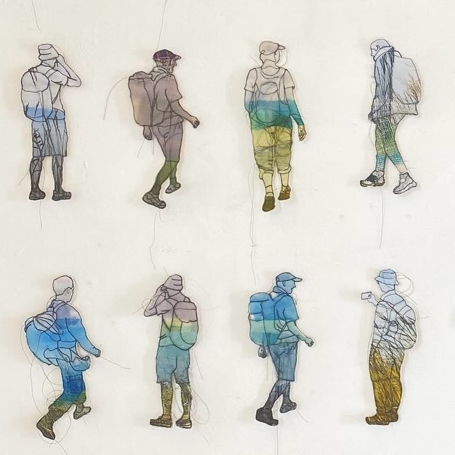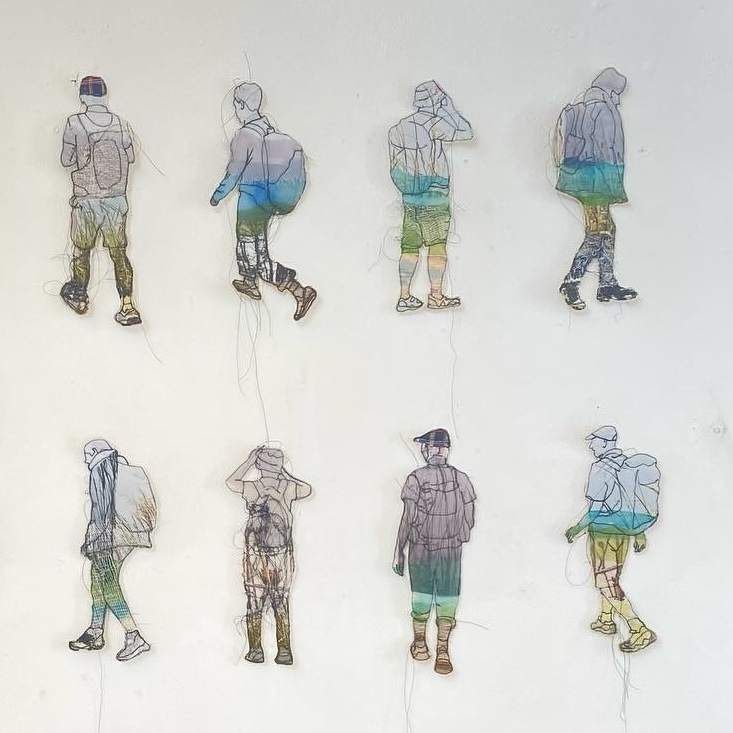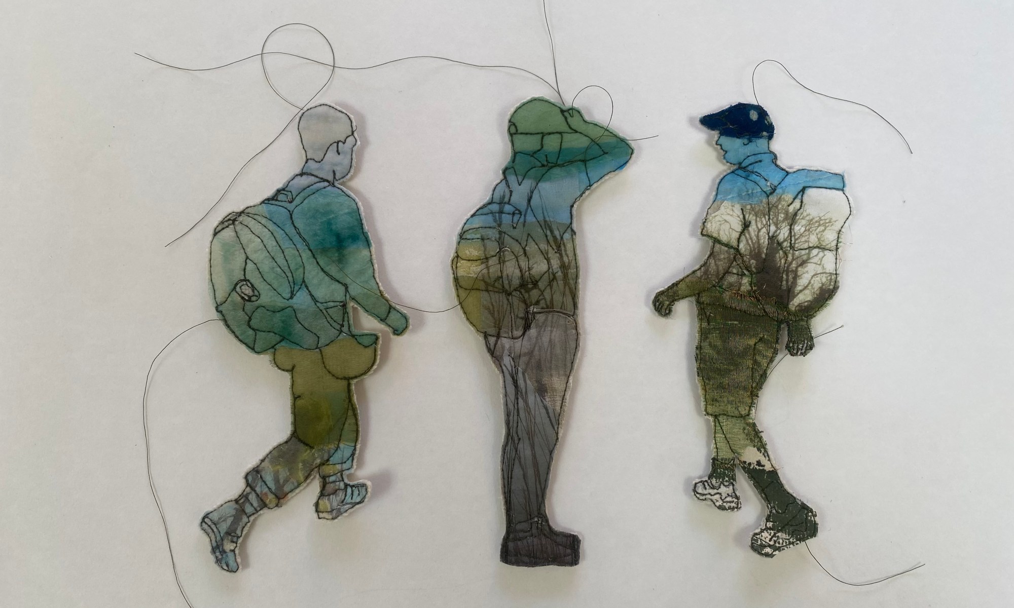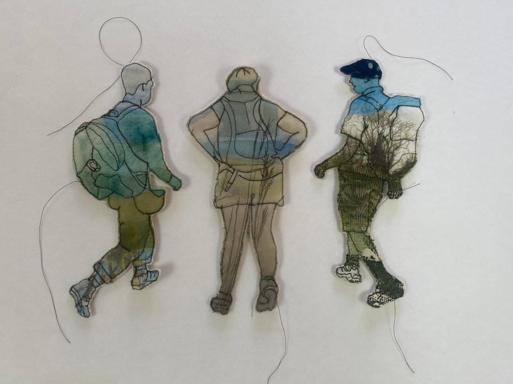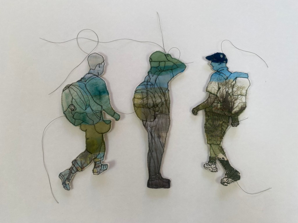 In my textile landscapes I have always used found materials and collected or donated fabrics. My aim more recently has been to become more fully sustainable, so I celebrate the use of all kinds of waste materials in my figure work. The walkers are layered with all sorts of scraps: paper, sheer fabrics, printed imagery so that they appear to be a part of the landscape they have been experiencing.”
