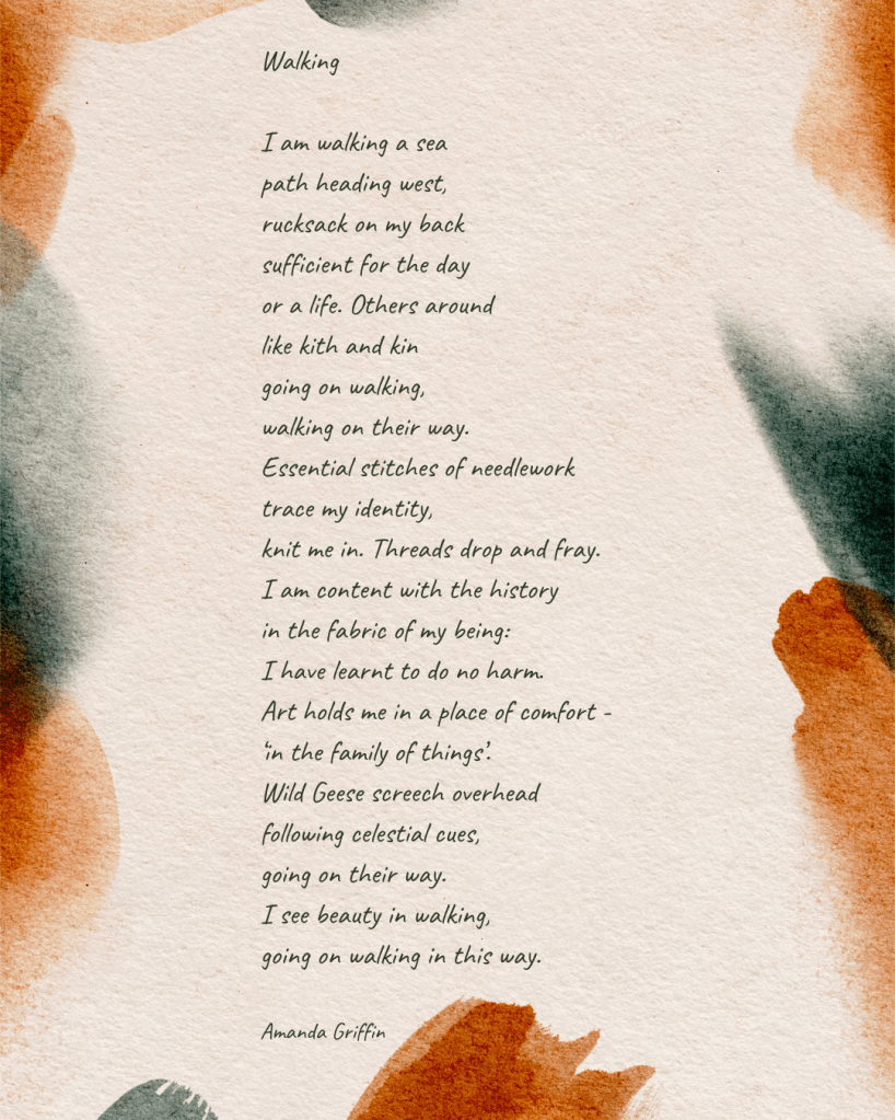 Amanda Griffin’s poem ‘Walking’ is written in direct response to Jane’s hiker textile pieces and is a beautiful collaboration between the two artists. Amanda says,
