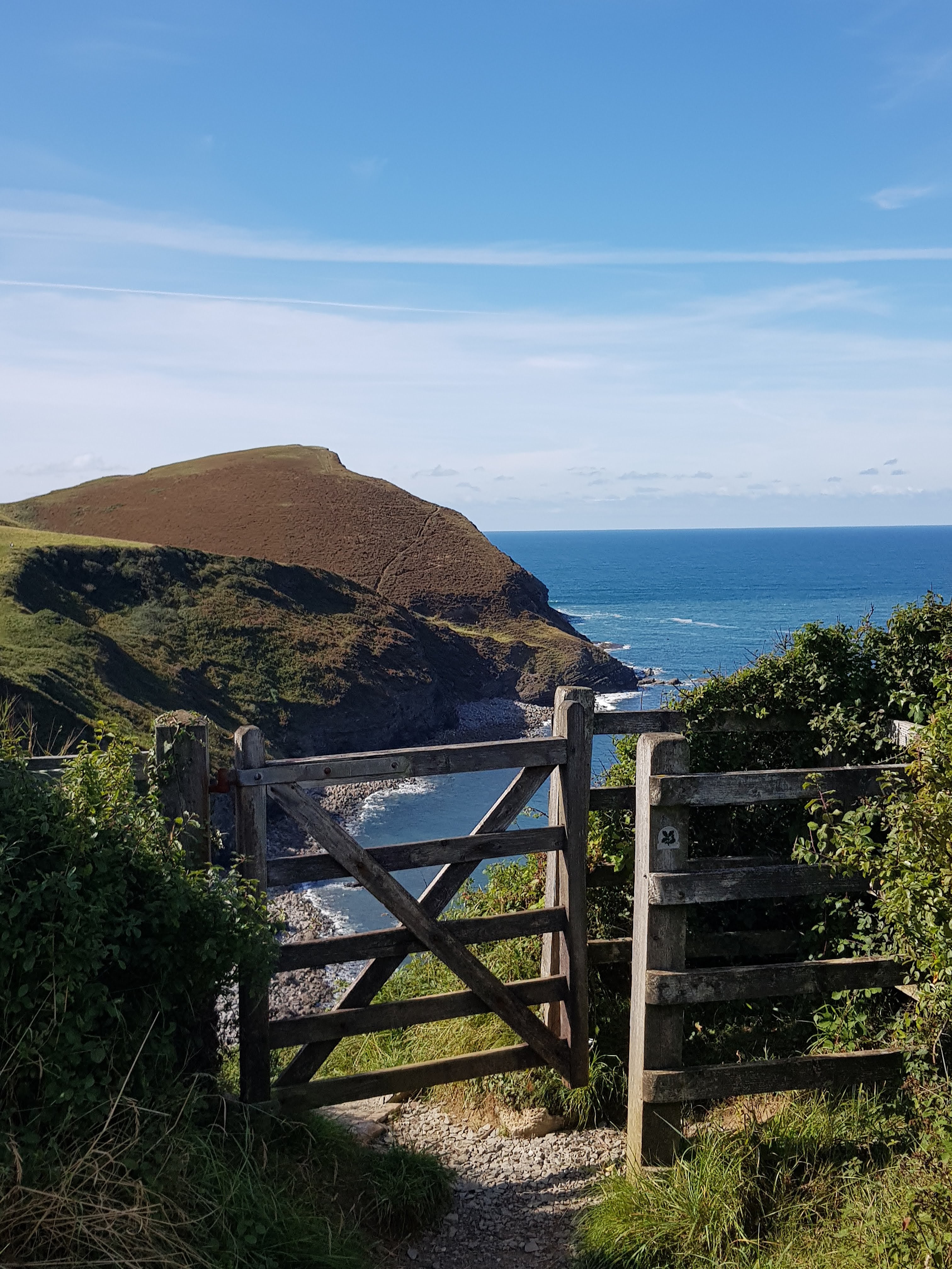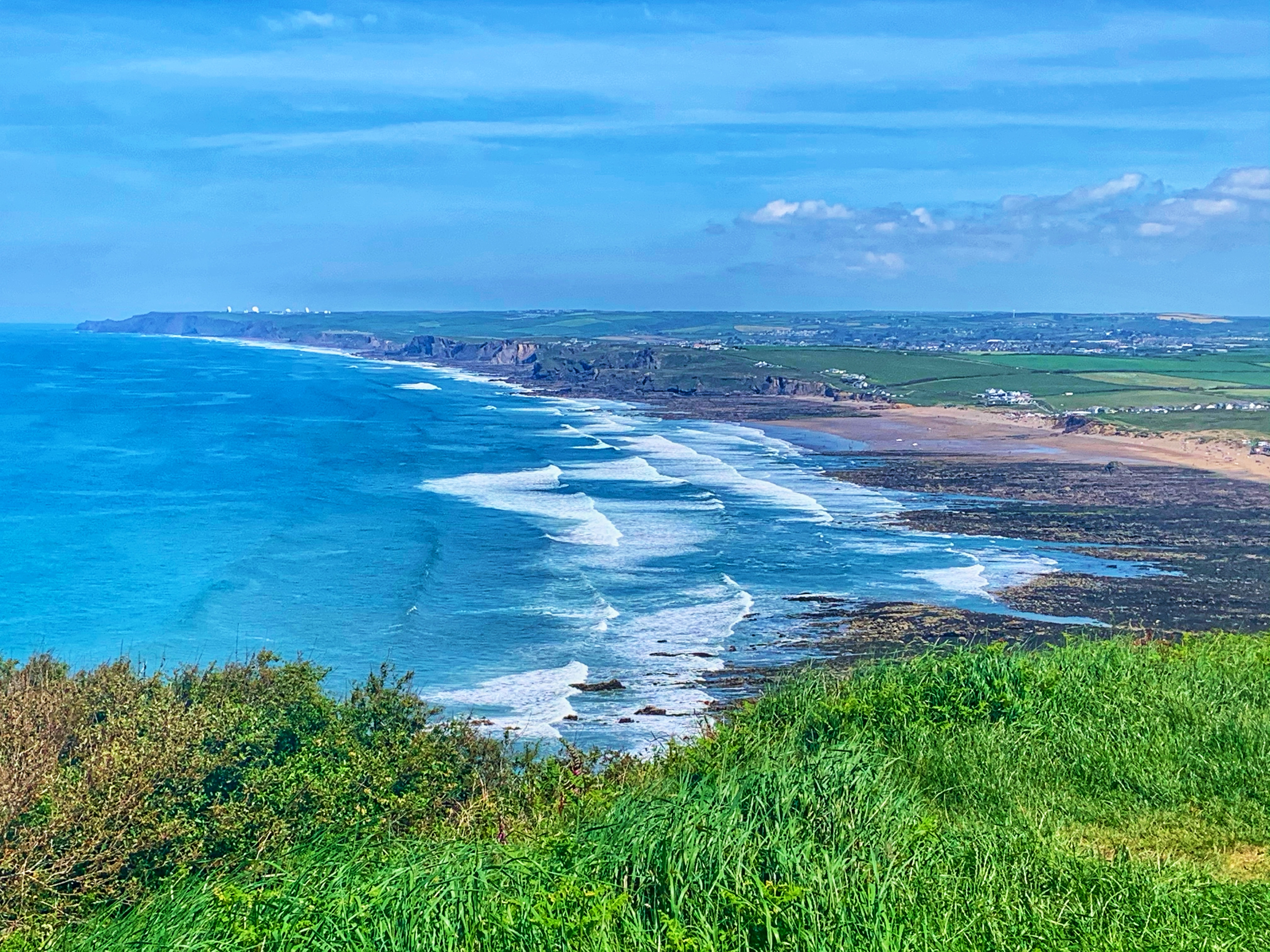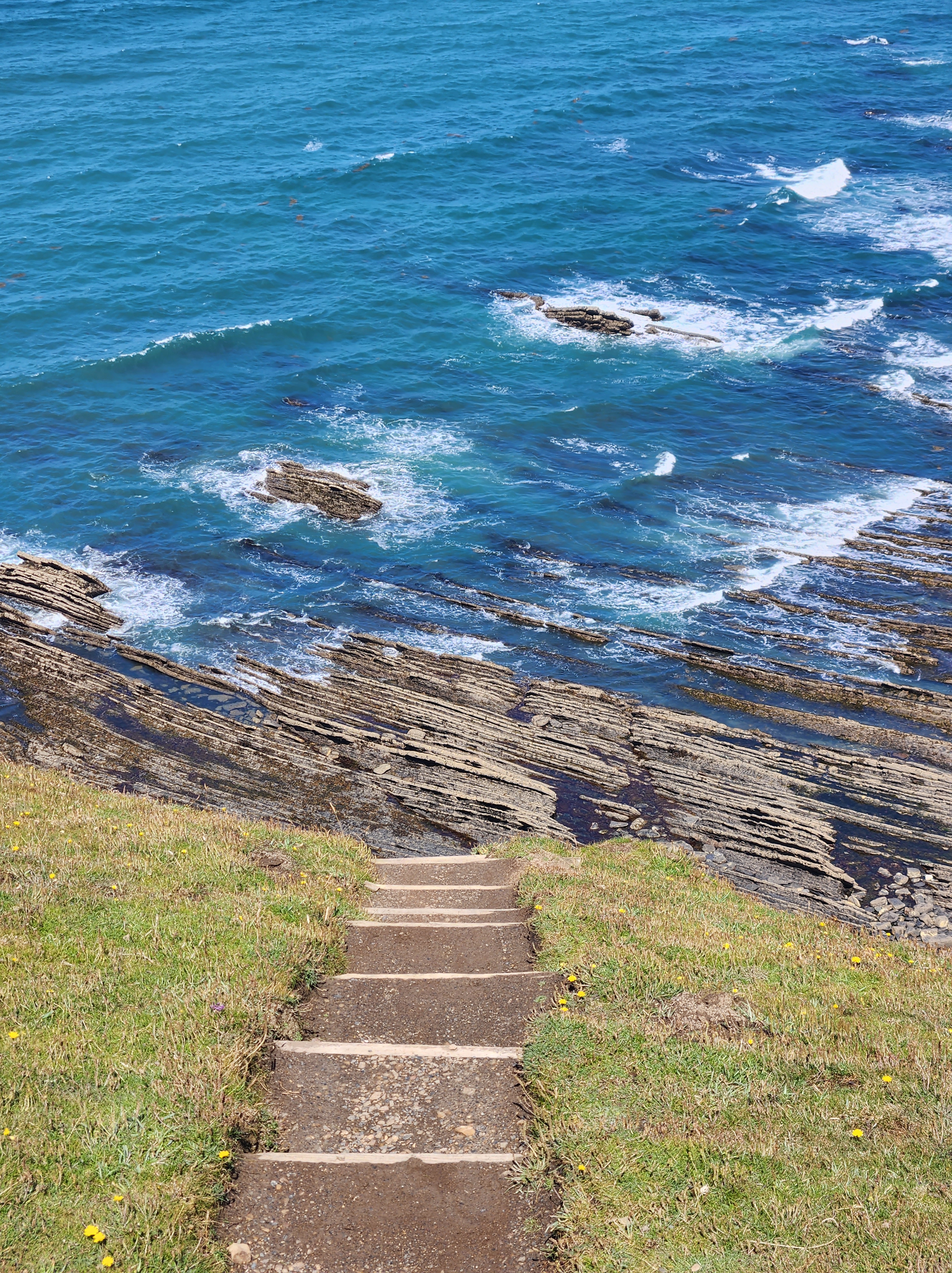 On the rare occasions you’re on the flat, one of the things I love most about walking the coast path is the wide, open views of the Atlantic, where you’re always aware of the force of the sea and the winds. This walk didn’t disappoint. The heat had ramped up, and the sea was calm for the North Coast, but it still looked wild and feral when we stopped and gazed at the different shades of blue, taking a moment to catch our breath. We also had our packed lunch since we were starving.