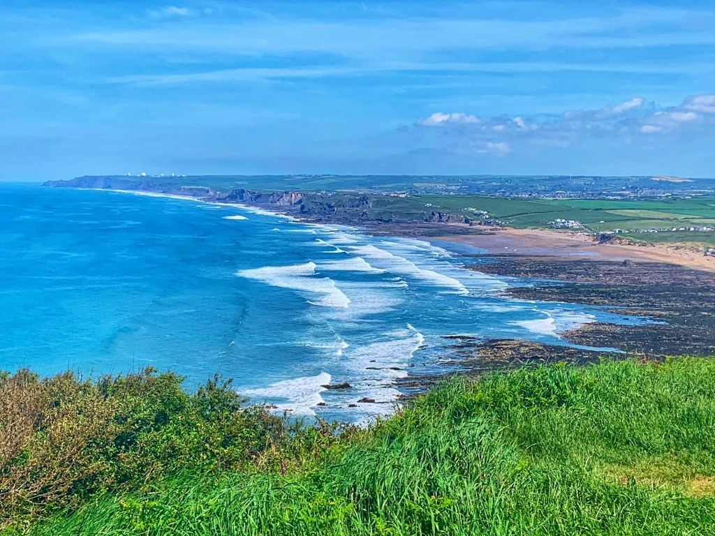 After a pleasant bus journey with coffee in hand, we headed towards Widemouth Bay, a rugged stretch of golden sands and dramatic cliffs. The early scent of seaweed mixed with the soft breeze hinted at a warm day ahead! I knew from our research on this section that this gentle start should not lead us to believe the whole day would be like this. The South West Coast Path notes described it as challenging and strenuous, and I’d visualised the triumph of completing it as I prepared to push beyond my comfort zone.