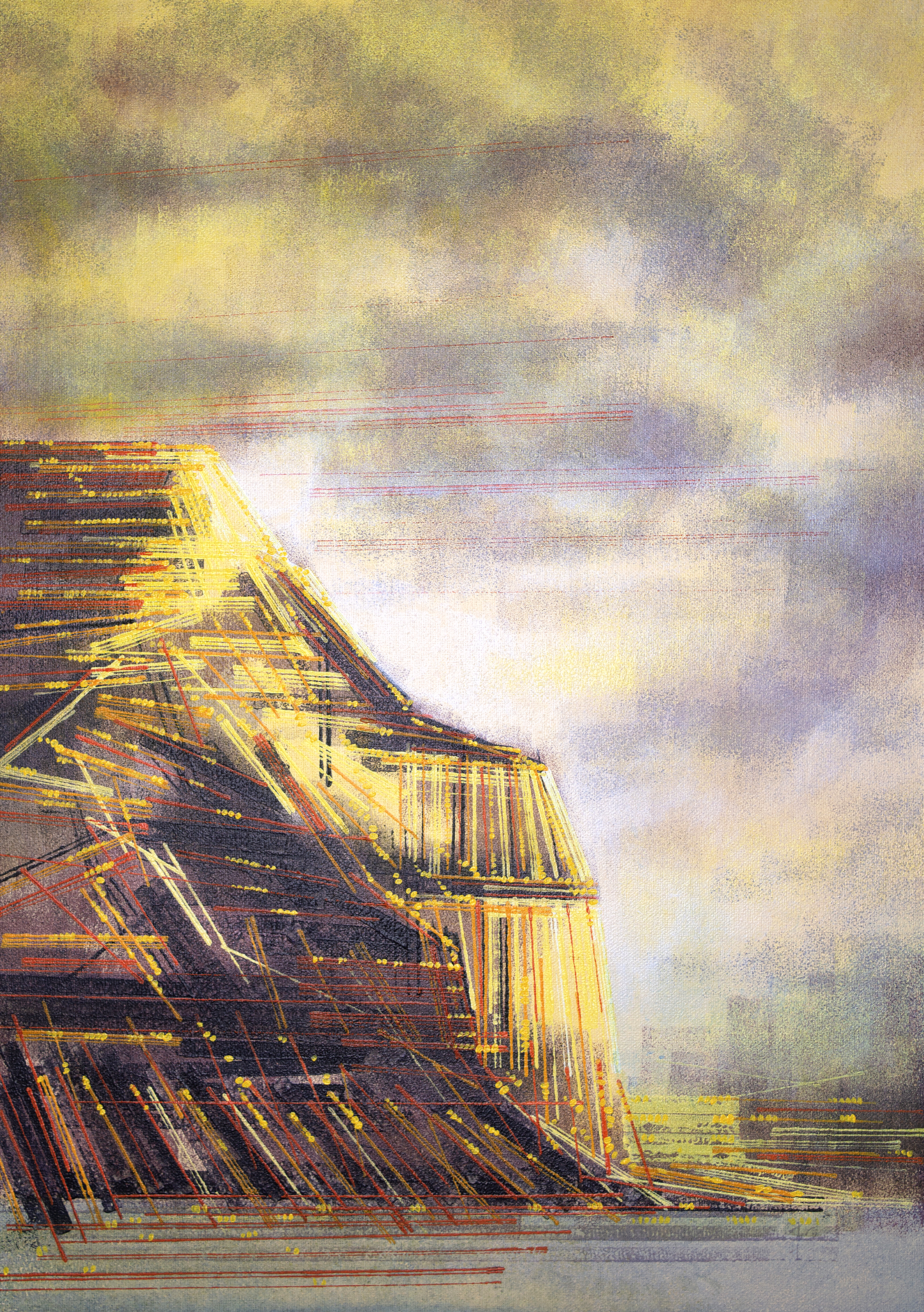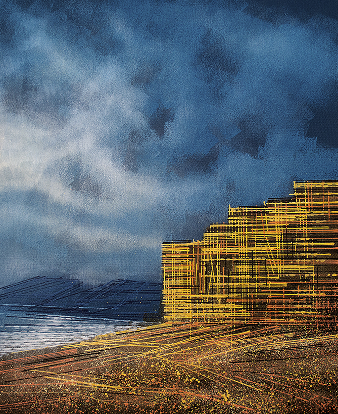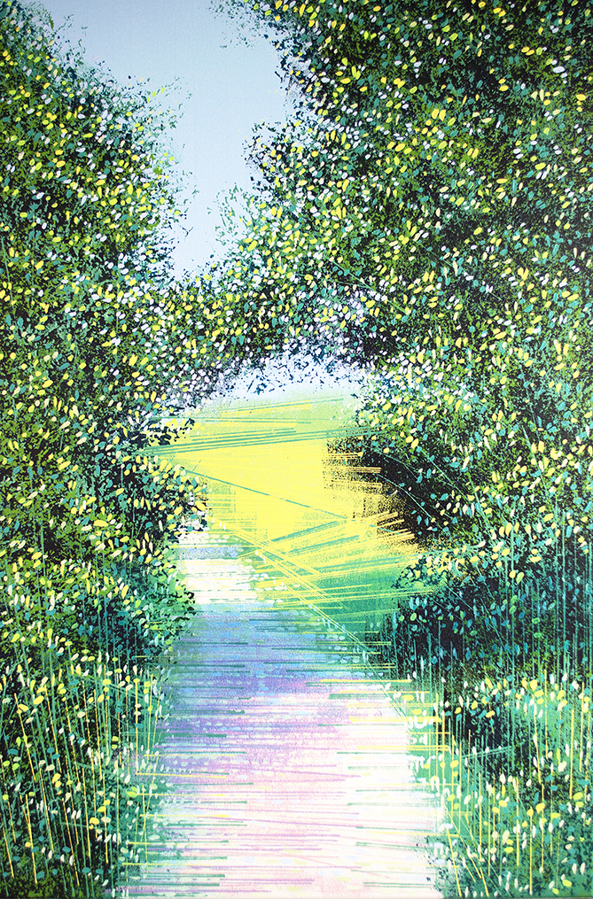 Acrylic paints are my medium of choice. Their fast-drying nature allows me to build up many layers of paint, creating richness of colour and texture. I use a variety of tools to apply the paint, including balsa wood strips, splatter brushes and sponges.