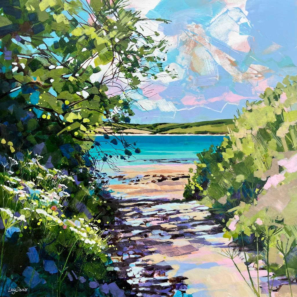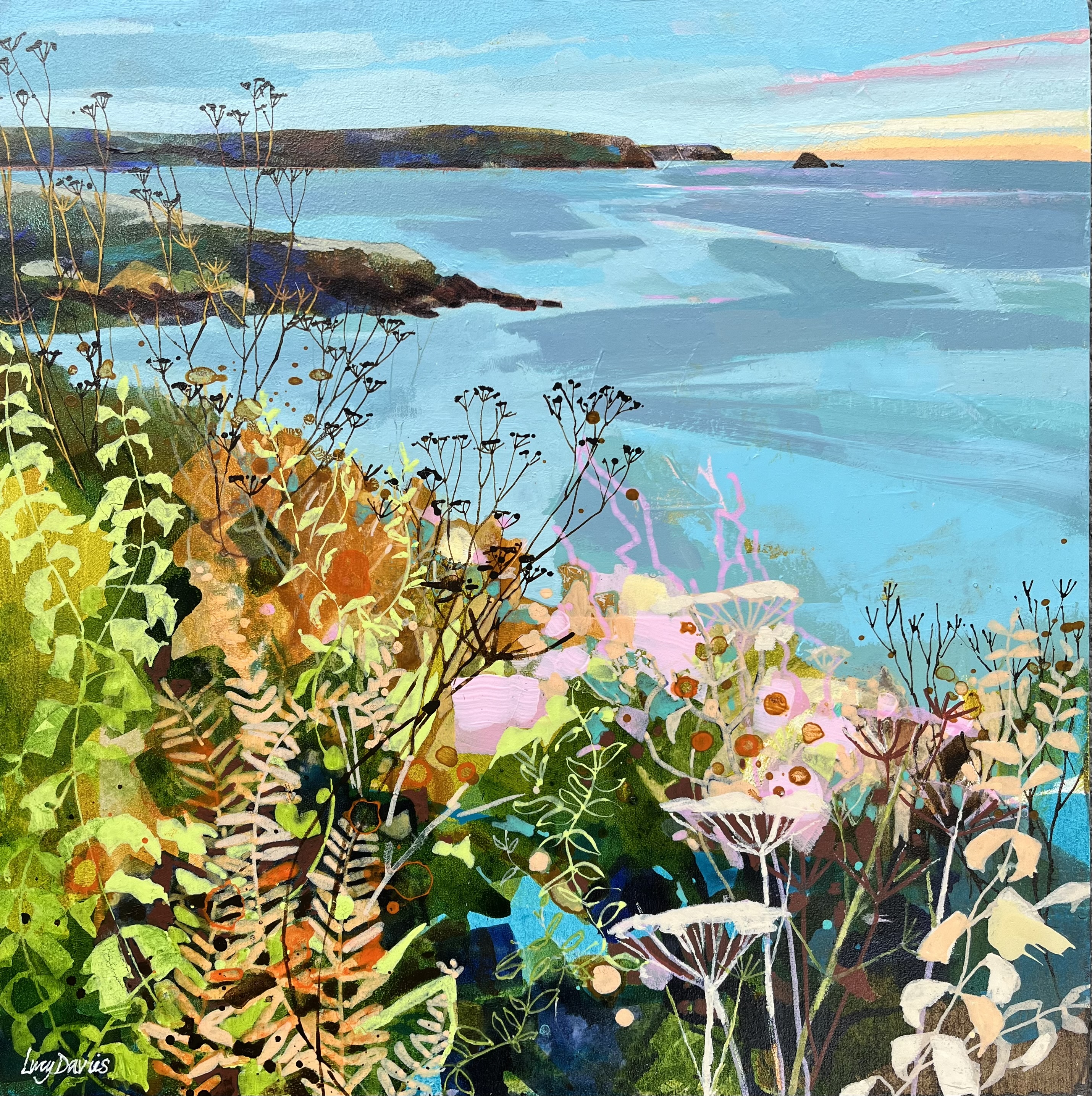 When Iโm working in Cornwall Iโm very must influenced by the ever changing coastline and rugged nature of the cliffs which are particularly dramatic on the north coast. I very much enjoy painting the rocks on the beach and as a colourist Iโm constantly looking for contrasts and tones, often exaggerating colour to add interest and visual impact. I really enjoy painting the wild flowers and plants that populate the cliff tops and boundaries of the coast path too, often getting down low so that my viewpoint is looking through the grasses and flowers to glimpse the sea beyond.
