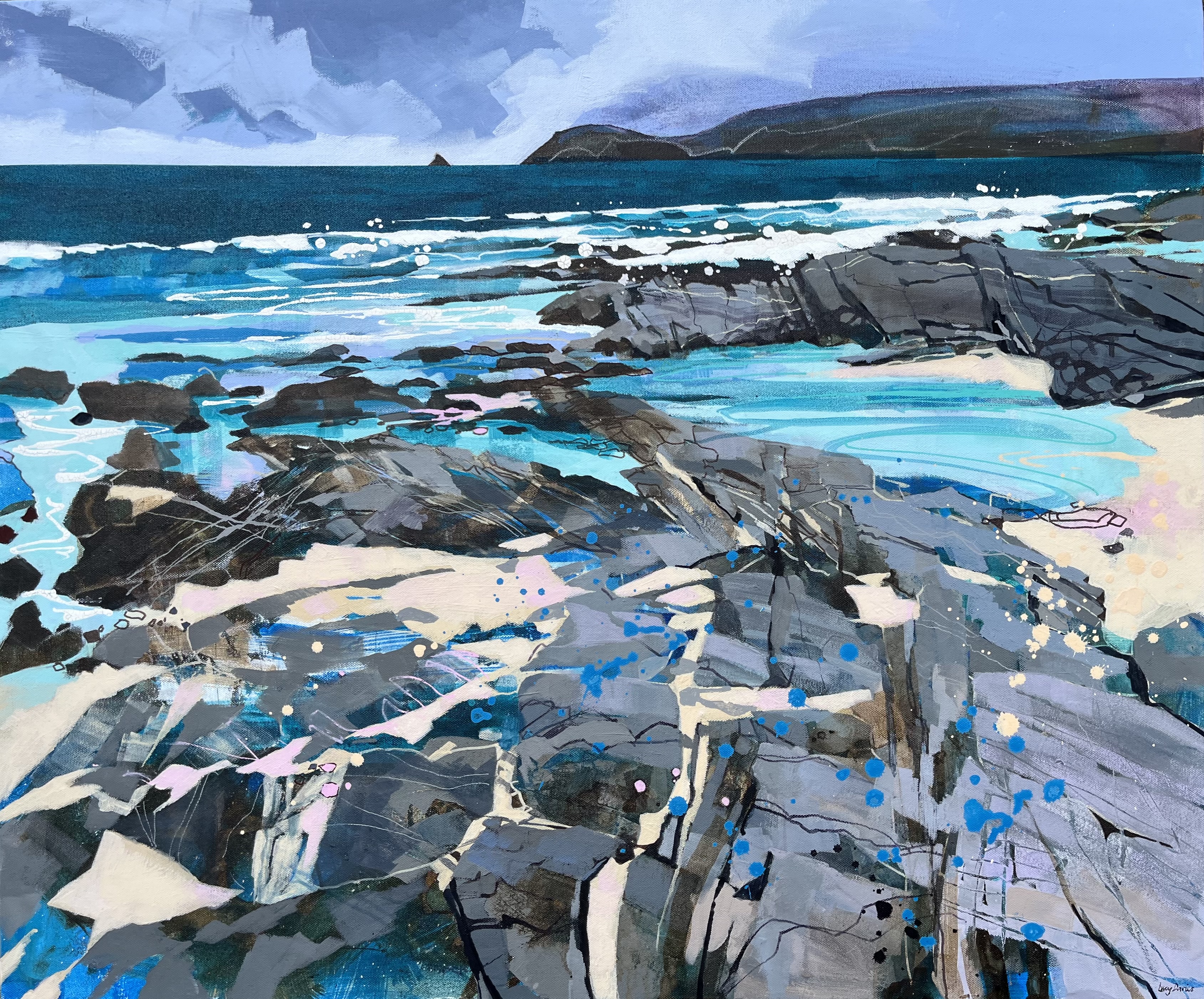 The beautiful and sometimes wild coastal scenery of Cornwall are the inspiration behind Lucyโs seascapes. The dramatic sea, rugged cliffs and stunning, golden beaches inform her work and provide the reference for her colourful, mixed media paintings.