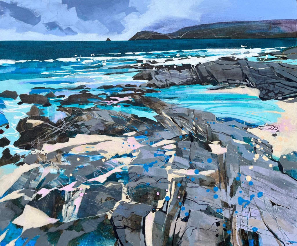 I predominantly paint in acrylics – using both paint and inks and enjoy creating mixed media pieces too. I work from quick sketches made on expeditions along the coast and from photographs. I sometimes incorporate collage into my work and really enjoy layering paint to create texture and depth. As I know a certain stretch of the Cornish coastline so well I feel I could almost paint it with my eyes closed and my imagination certainly plays a big role when it comes to getting a composition down on canvas. In Winter I work in my studio based in Hertfordshire but in the Spring and Summer I work from my caravan and try to paint outdoors as much as the weather allows – my caravan is incredibly close to the coast path and edge of the cliffs so inspiration is close at hand !